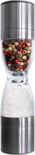Pratique moulin manuel double TORO en forme de sablier permettant de moudre séparément le sel et le poivre sur des côtés opposés. Il offre des couvercles anti‑déversement, une fabrication en acier inoxydable résistante et des dimensions compactes pour un usage quotidien en cuisine.