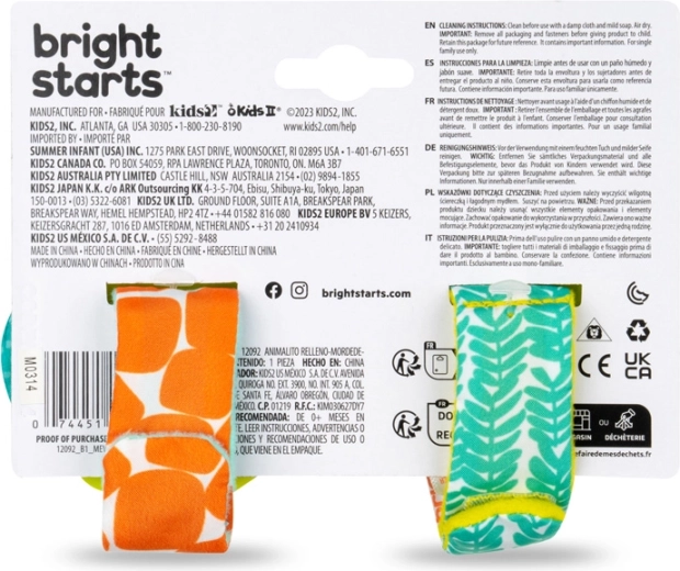 Les adorables jouets de poignet BRIGHT STARTS ravissent bébé à chaque mouvement. Chacun comporte un animal en peluche doux et un anneau de dentition sûr pour soulager lors de la poussée dentaire. Grâce à la fermeture réglable au poignet, ils restent toujours à portée de main, favorisent la motricité fine et offrent une stimulation sensorielle colorée dès la naissance.