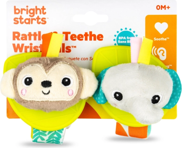 Hochets de poignet avec anneau de dentition BRIGHT STARTS – singe et éléphant, lot de 2