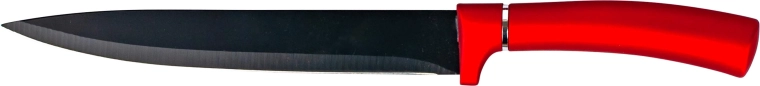 Couteau à trancher pratique pour une découpe précise de la viande, du pain et des légumes, avec une poignée ergonomique de couleur rouge et argentée. Il offre des coupes nettes et régulières, une prise en main confortable et un design moderne adapté à toute cuisine.