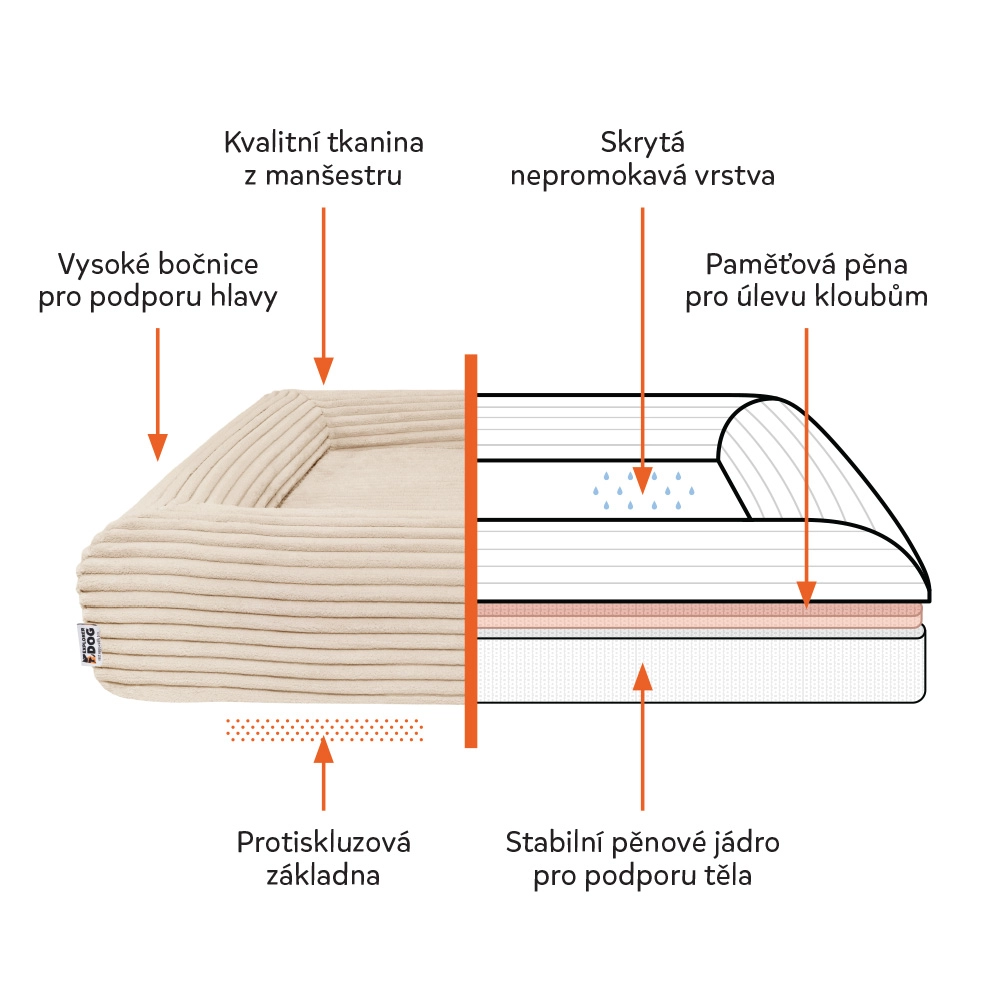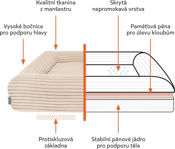 La housse en velours côtelé doux (100 % polyester) est moelleuse, à séchage rapide et résistante aux odeurs, certifiée OEKO-TEX Standard 100. Le noyau en mousse certifié CertiPUR-US ne contient pas de substances nocives. Grâce aux fermetures éclair YKK, la housse se retire facilement et se lave en machine à 30 °C. La couche intérieure imperméable protège le noyau de l’humidité et le dessous antidérapant maintient fermement le panier en place sur carrelage comme sur parquet flottant.