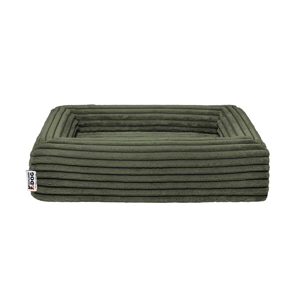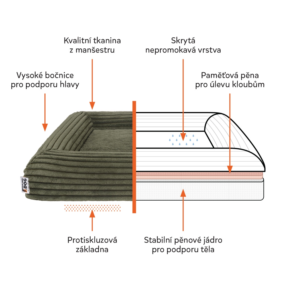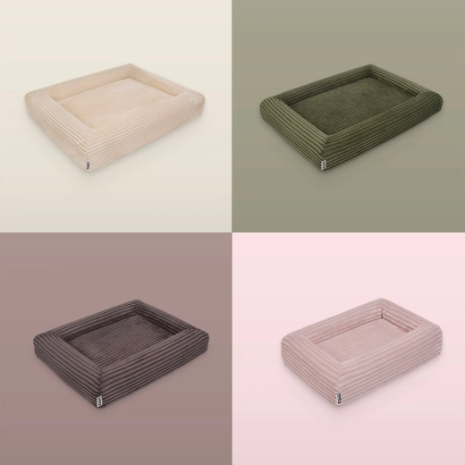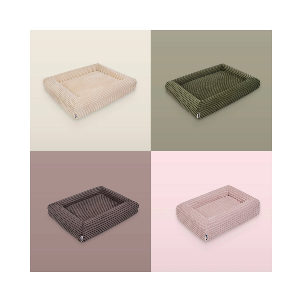 La housse en velours côtelé doux (100 % polyester) est agréable au toucher, sèche rapidement et est résistante aux odeurs. Elle répond à la norme OEKO‑TEX Standard 100, les mousses sont certifiées CertiPUR‑US – sans formaldéhyde ni métaux lourds. Grâce aux fermetures éclair YKK, la housse se retire facilement et se lave à 30 °C. Une couche intérieure imperméable protège le noyau de l’humidité et des saletés, et la face inférieure antidérapante maintient le panier bien en place.