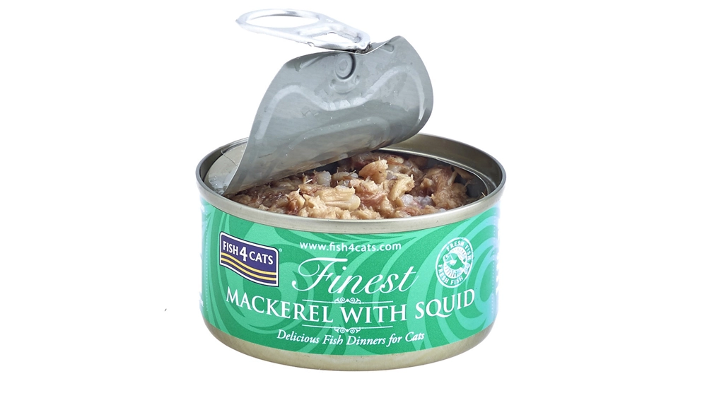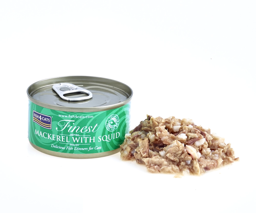 Jusqu’à 65 % de maquereau complété par des calamars et du bouillon de poisson – une recette riche en protéines animales que les chats adorent et digèrent bien.
