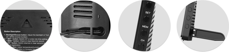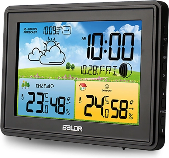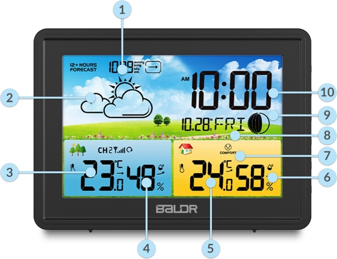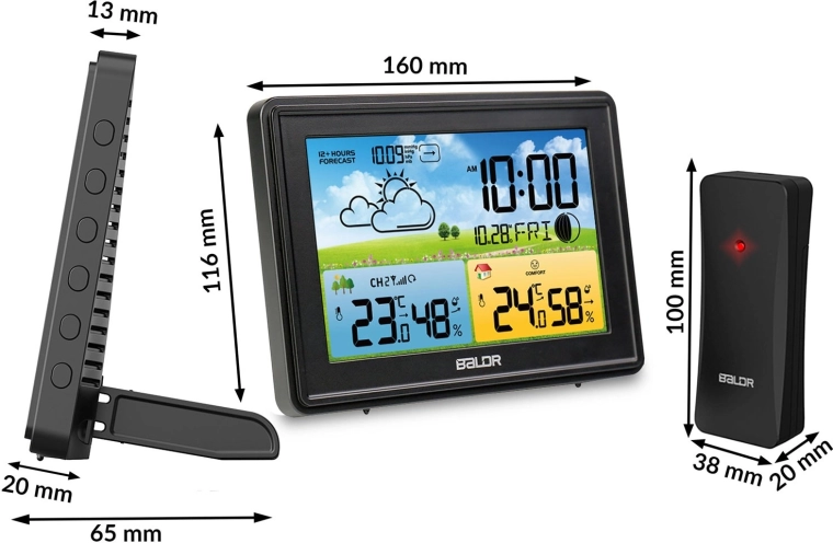 Le capteur extérieur sans fil (portée jusqu’à 60 m) transmet les valeurs actuelles, affichées à côté des données des capteurs internes. L’écran LCD couleur, avec 3 niveaux de rétroéclairage (100 %, 60 %, 5 %) ou sans rétroéclairage, garantit une lecture confortable même la nuit. Sont inclus indicateur de confort, phases de la Lune, réveil et fonction snooze, ainsi que indication du niveau de batterie pour la station et le capteur.