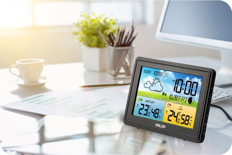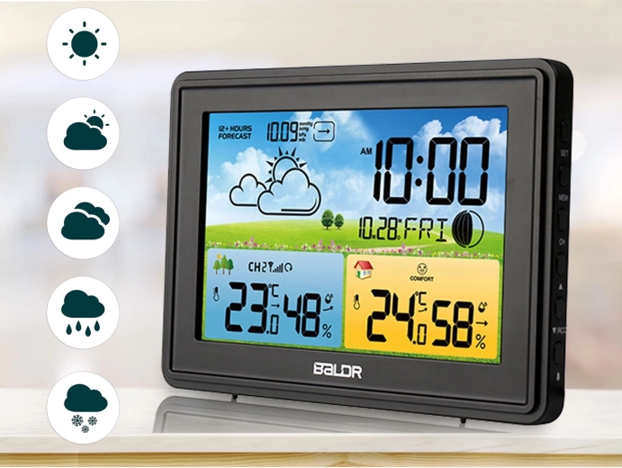 Station météorologique sans fil moderne avec écran LCD couleur, prévision sur 12 heures et synchronisation horaire automatique DCF77. Mesure la température et l’humidité intérieures et extérieures, affiche la pression barométrique, les phases de la Lune, le niveau de confort et propose un réveil avec fonction snooze. Grâce au rétroéclairage lumineux à trois niveaux, tout reste parfaitement lisible de jour comme de nuit.