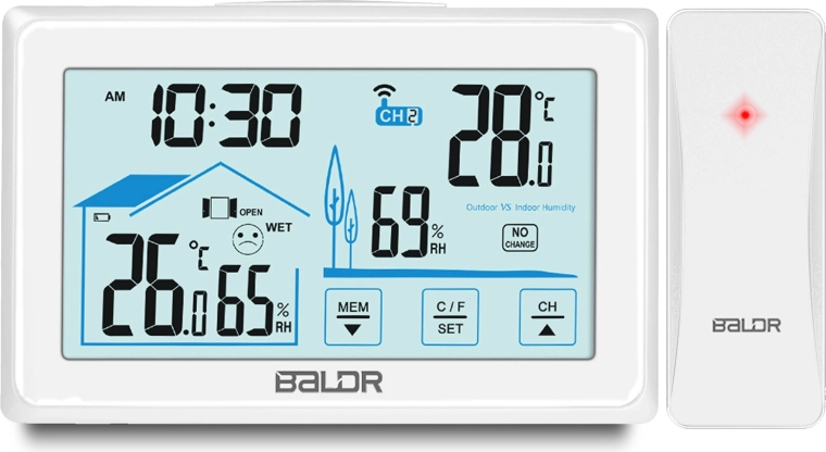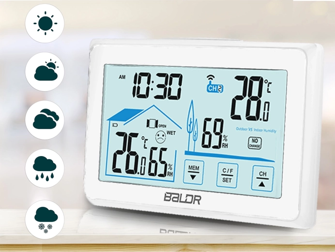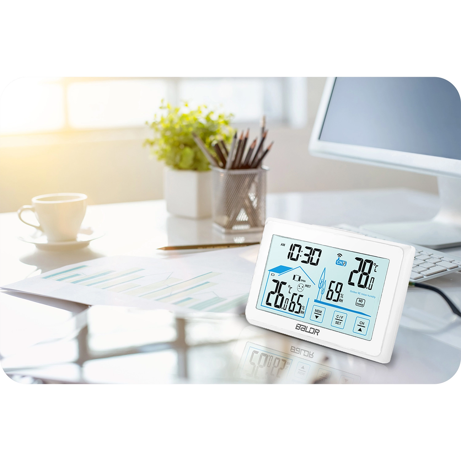 Un écran extra-large et facile à lire avec rétroéclairage affiche l’heure, la température et l’humidité pour l’intérieur et l’extérieur, y compris les tendances et le niveau de confort.