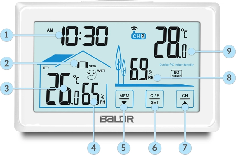 Grâce à la mémoire min./max., détectez rapidement les variations climatiques. Des fonctions intégrées telles que l’heure 12/24 h, le basculement °C/°F et l’alerte “ouvrir/fermer la fenêtre” facilitent l’aération intelligente et les économies d’énergie. De grands chiffres et un rétroéclairage simplifient la lecture de jour comme de nuit.