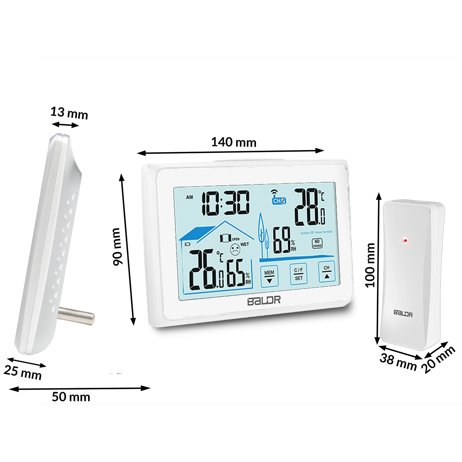 Station météo numérique sans fil avec grand écran LCD rétroéclairé affichant la température et l’humidité intérieures et extérieures, mémorisant les valeurs min./max. et indiquant un indice de confort. Données faciles à lire, format horaire 12/24 h, sélection °C/°F et état de la batterie pour l’unité et le capteur. Inclut un capteur sans fil avec une portée allant jusqu’à 60 m.