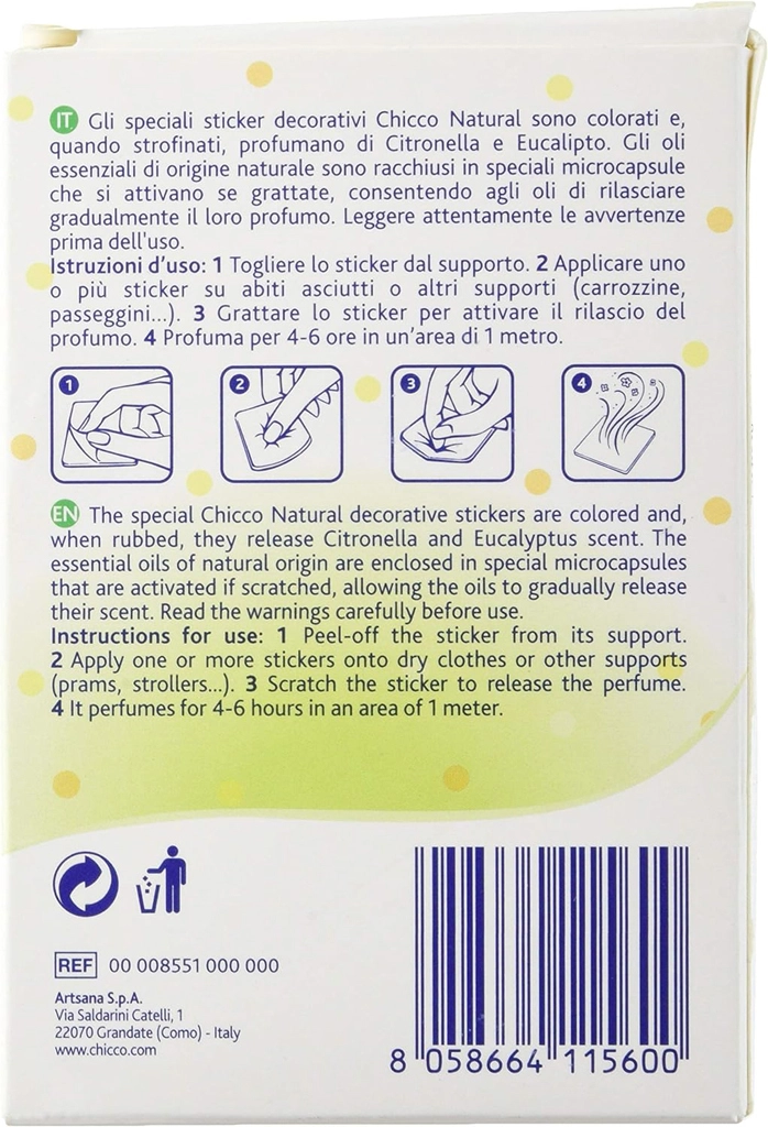 Protégez-vous, ainsi que vos enfants, des insectes gênants avec les autocollants parfumés naturels Chicco. Grâce aux huiles essentielles (citronnelle et eucalyptus citriodora) et aux microcapsules, le parfum se libère lentement après activation par frottement. Les autocollants sont idéaux pour les activités de plein air, les excursions et une utilisation quotidienne.