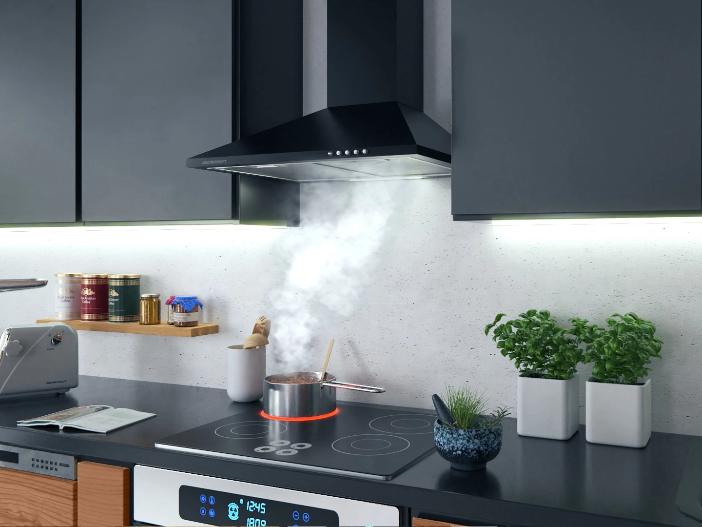 La hotte murale cheminée Berdsen BT-214 noire s’intègre parfaitement aux cuisines modernes comme classiques. Ses lignes épurées, ses caches de cheminée télescopiques et sa finition mate en acier inoxydable apportent une allure professionnelle, tandis que la filtration efficace retient la graisse et améliore la qualité de l’air pendant la cuisson.