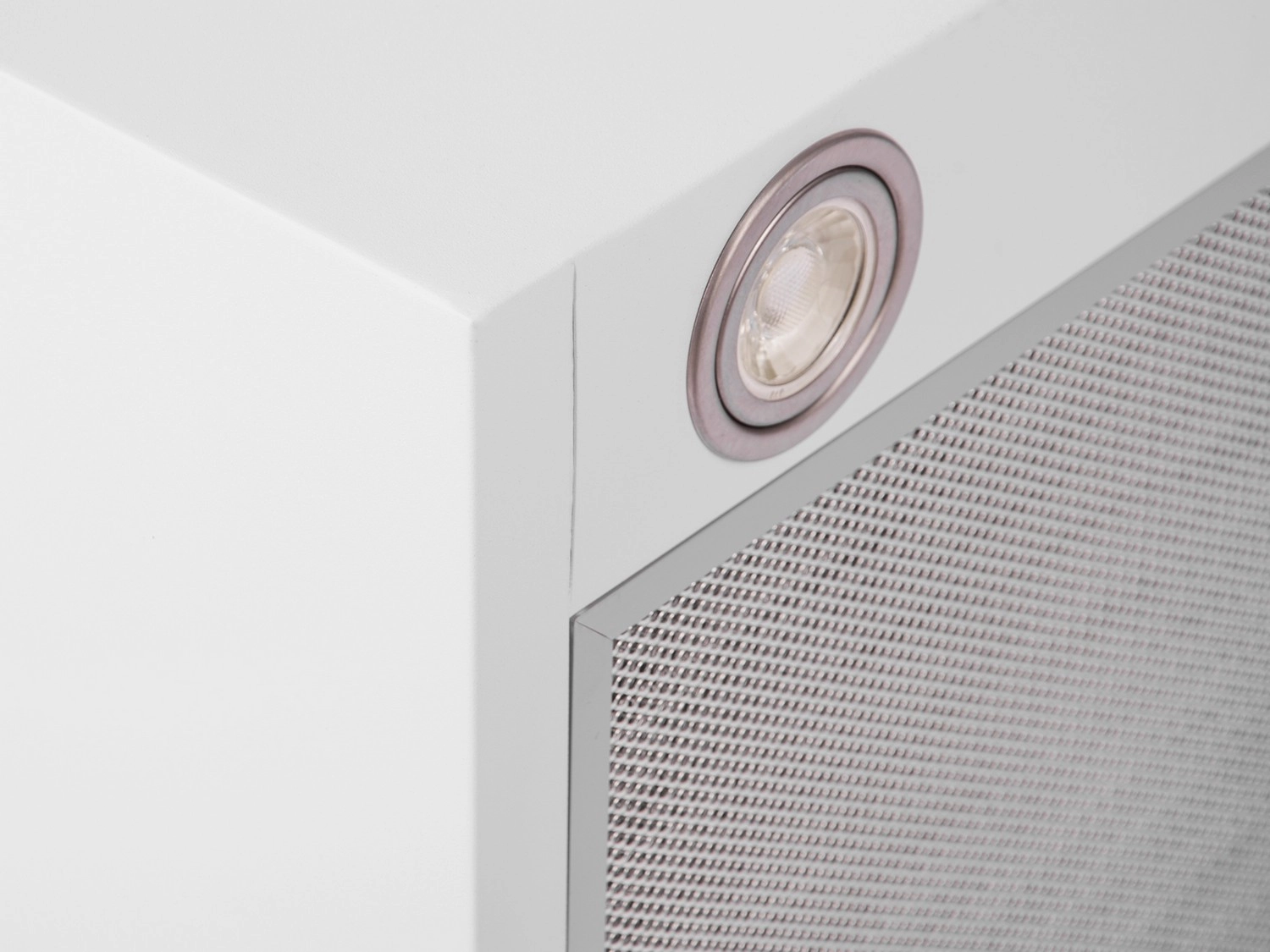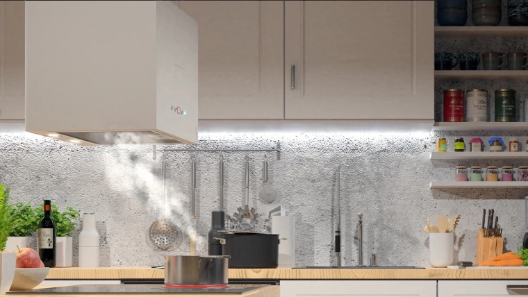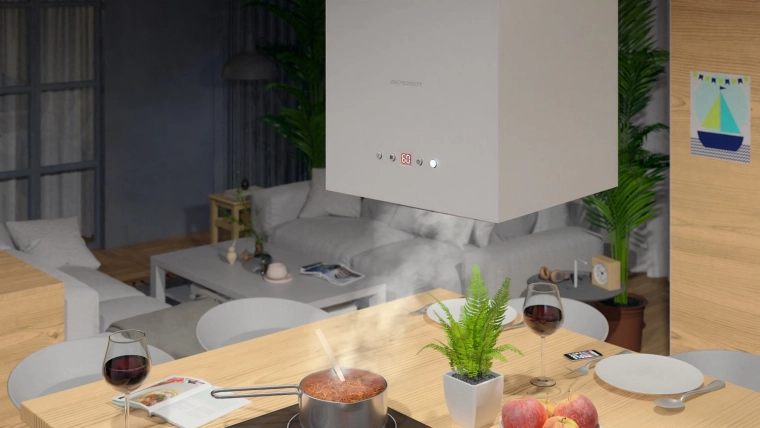 Un corps compact en forme de cube, en acier blanc et suspendu par des câbles, économise de l’espace et complète avec élégance les cuisines minimalistes et ouvertes.