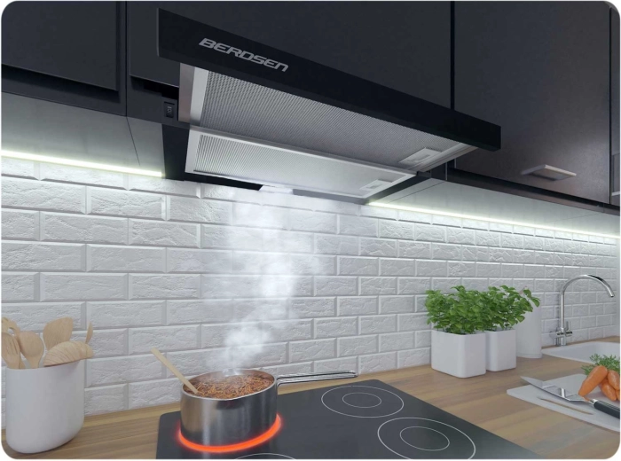La hotte télescopique encastrable élégante BERDSEN élimine efficacement vapeur, odeurs et graisses à la source. Grâce à la lisse coulissante, vous obtenez une plus grande surface d’aspiration et une meilleure efficacité, tandis que le corps compact reste dissimulé dans le meuble. Vous apprécierez aussi l’éclairage LED 2 W économe, qui illumine parfaitement la table de cuisson.