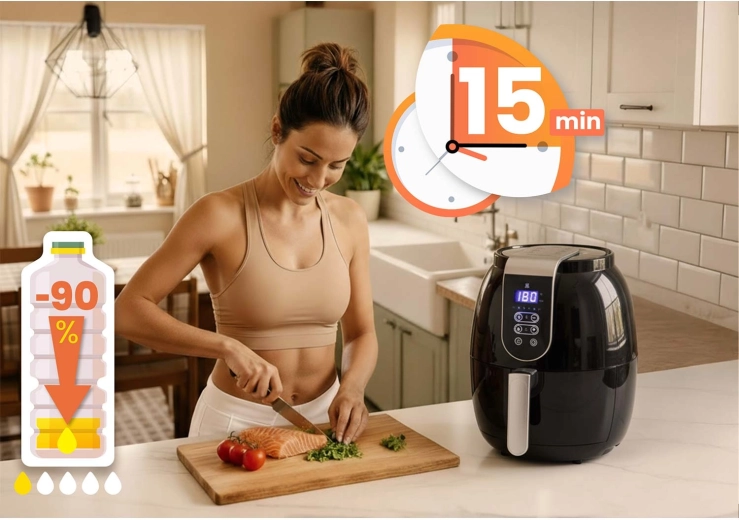 La circulation d’air chaud garantit une croûte dorée et un cœur juteux – frites, poulet, légumes et viennoiseries seront plus légers et savoureux, avec jusqu’à 90 % de gras en moins qu’une friture à l’huile.