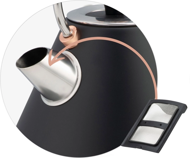 La bouilloire offre une chauffe rapide de 1850–2200 W, une base rotative 360° pour droitiers et gauchers, ainsi qu’un range‑câble pratique. Le filtre métallique anti‑calcaire dans le bec retient les dépôts, tandis que la protection contre le fonctionnement à sec et l’interrupteur rétroéclairé renforcent sécurité et confort.