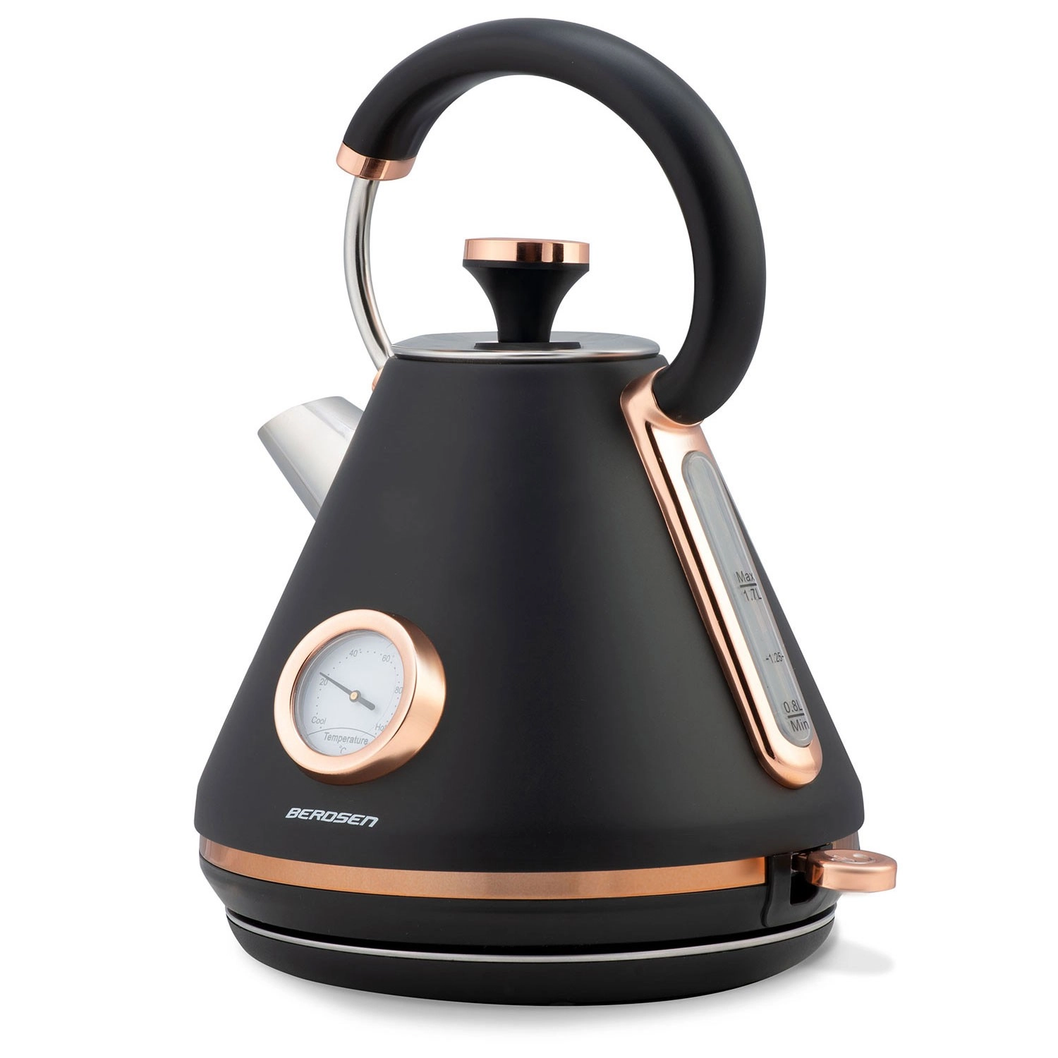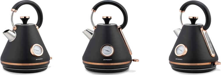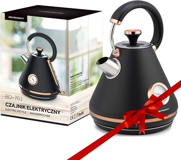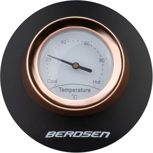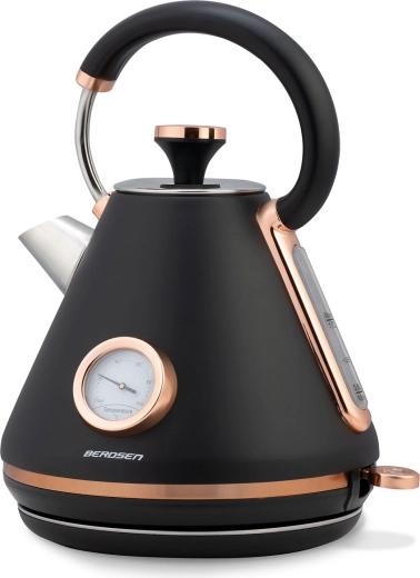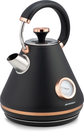 Bouilloire rétro élégante Berdsen 1,7 l avec thermomètre analogique intégré pour une préparation précise du thé et du café. Elle offre un corps métallique à finition mate, une base rotative à 360°, un interrupteur rétroéclairé, une poignée qui ne chauffe pas et un filtre anti‑calcaire amovible pour une eau plus propre. Un couvercle amovible, un indicateur de niveau d’eau et des pieds antidérapants assurent une utilisation confortable et sûre.