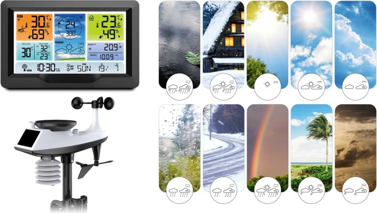 Pour plus de confort, on trouve une alarme avec fonction snooze, un calendrier jusqu’en 2099, le DCF77 pour le réglage automatique de l’heure et des alarmes de température extérieure haute/basse avec alerte gel. L’écran couleur LCD offre 3 niveaux de rétroéclairage (100 % / 50 % / 10 %) ou une extinction totale. La station prend en charge une connexion sans fil du capteur jusqu’à 100 m et la possibilité d’alimentation solaire pour le module extérieur.