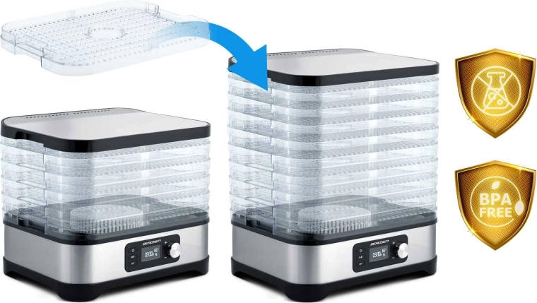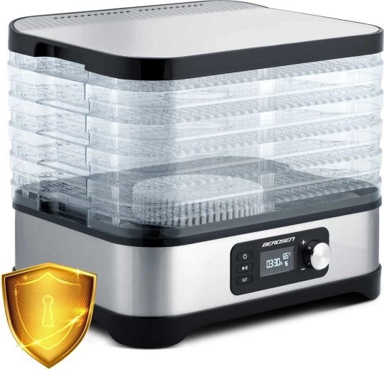 Le séchage maison de fruits, légumes, champignons, herbes et même de viande n’a jamais été aussi simple. Le déshydrateur alimentaire Berdsen offre une capacité de 10 l, 5 plateaux empilables, une régulation continue de la température de 35 à 70 °C et un minuteur de 1 à 24 h. Grâce à la circulation d’air uniforme, vous obtenez des en-cas croustillants et parfumés sans ajout de sucre ni de conservateurs. Il dispose bien sûr d’une protection contre la surchauffe et d’un entretien facile.