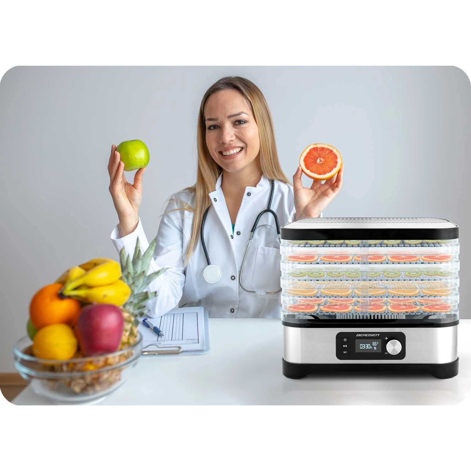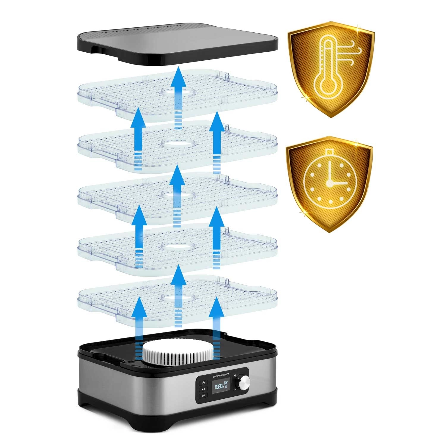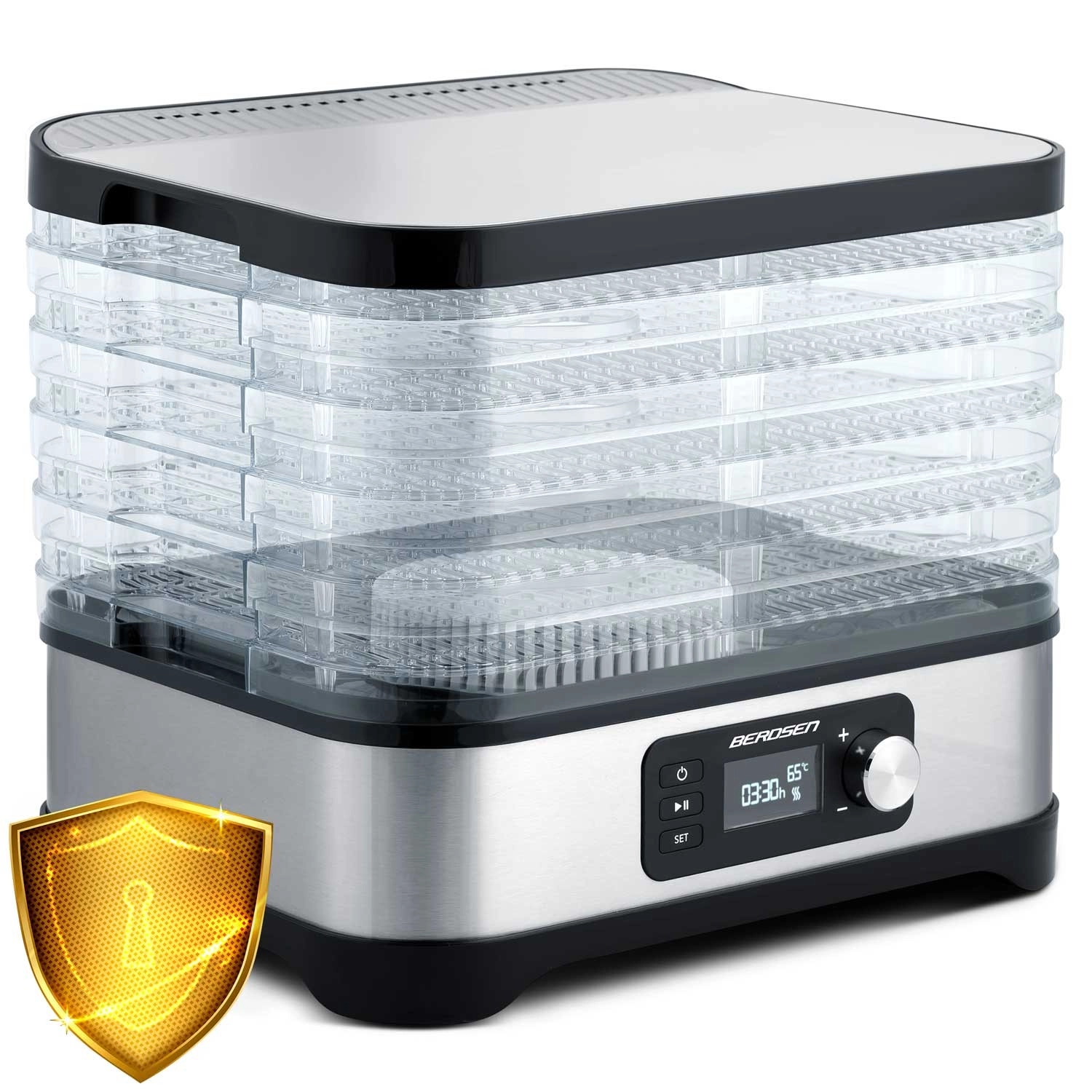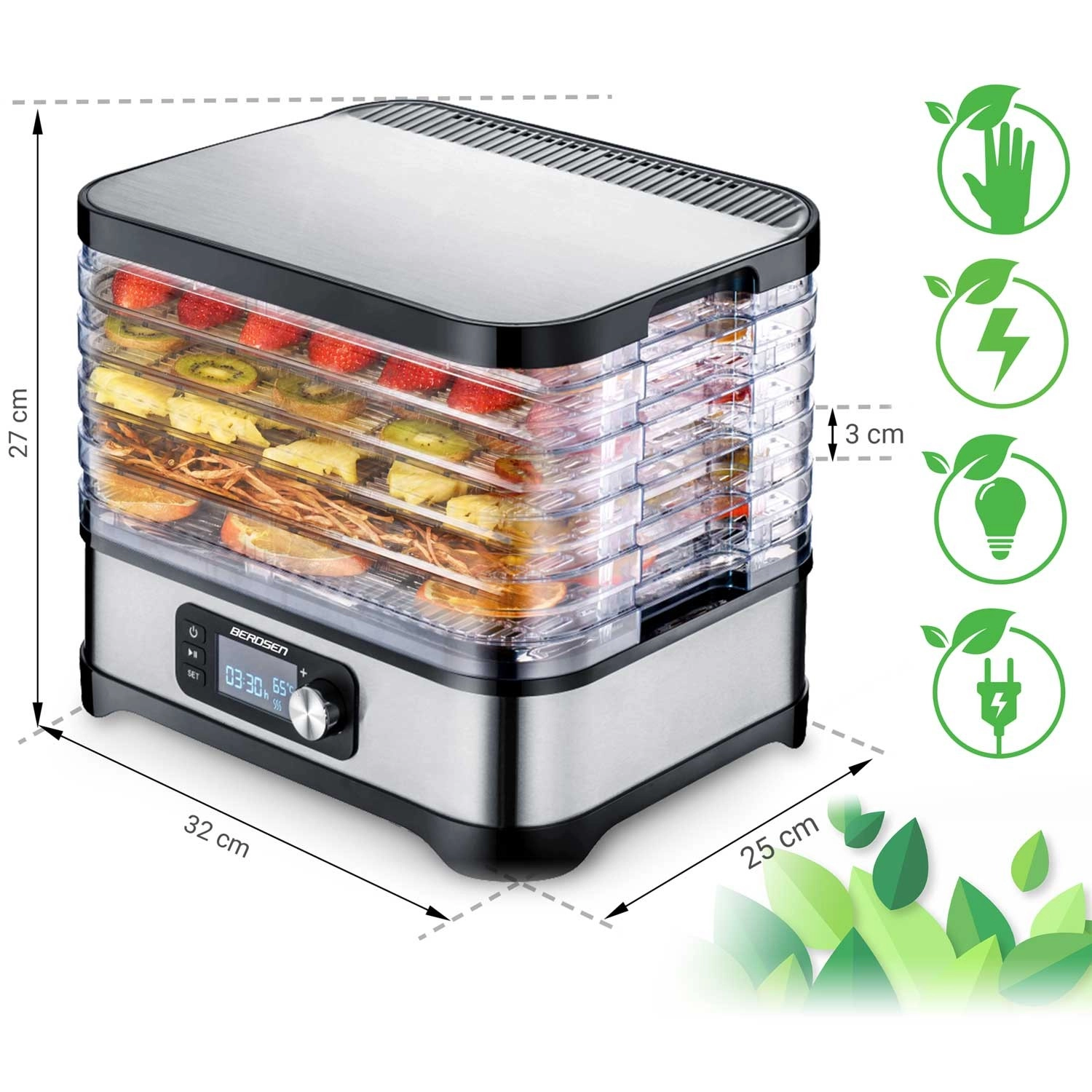 Profitez de snacks sains toute l’année – pommes, prunes, fraises, herbes et champignons séchés exactement selon vos goûts. Le déshydrateur Berdsen associe un chauffage performant de 400 W à une commande électronique précise de la température, pour un séchage doux et homogène. Le panneau intuitif permet de régler un minuteur de 1 à 24 heures pour un fonctionnement sans souci.