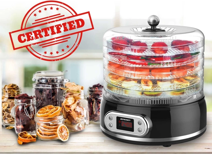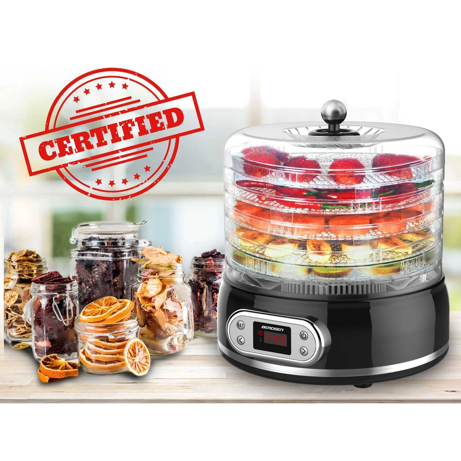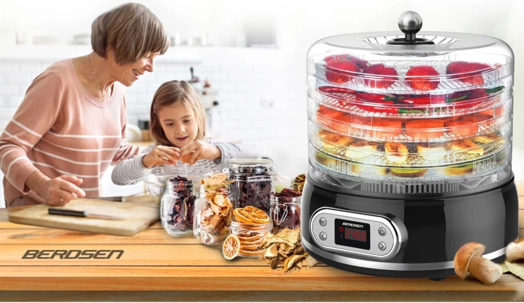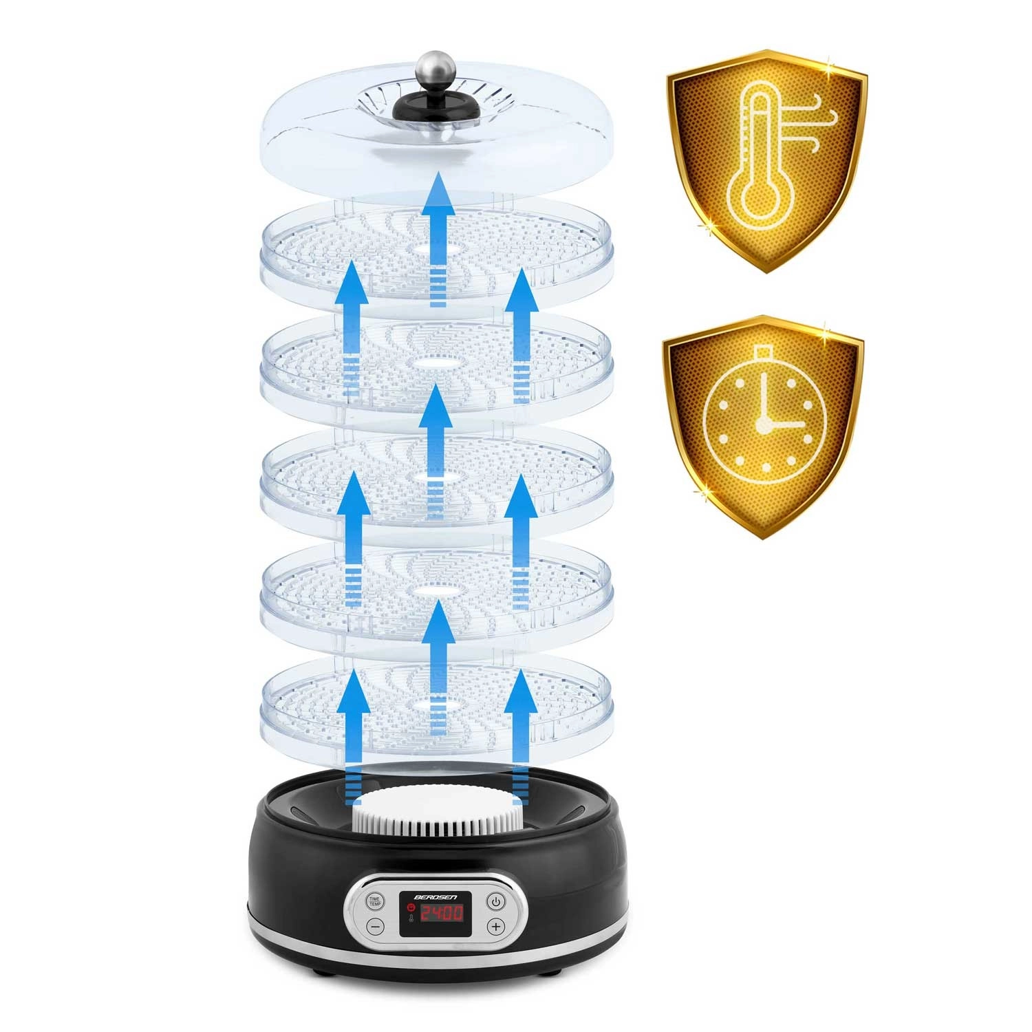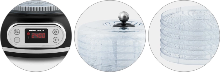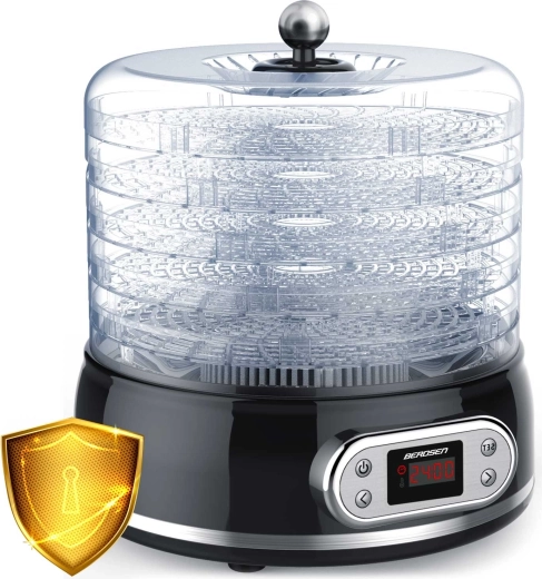 Profitez du séchage maison des champignons, fruits, légumes, herbes et viandes toute l’année. Le déshydrateur alimentaire Berdsen offre une capacité de 10 l, 5 plateaux transparents, une réglage continu de la température de 35 à 70 °C et une minuterie numérique de 1 à 72 h. Grâce à la circulation thermique, il sèche uniformément et rapidement, dispose d’une protection contre la surchauffe et répond aux certifications de sécurité CE et RoHS.
