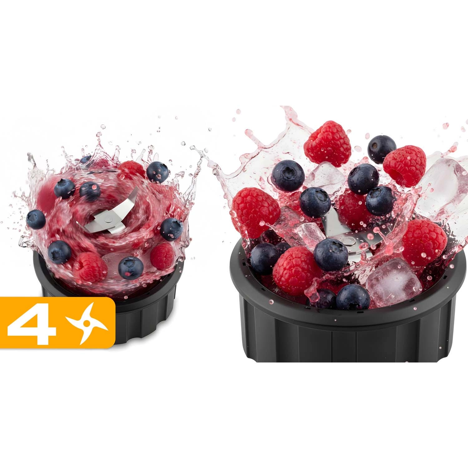 Le moteur de 800 W et les lames tranchantes en acier inoxydable gèrent les ingrédients durs et les glaçons, pour des résultats lisses.