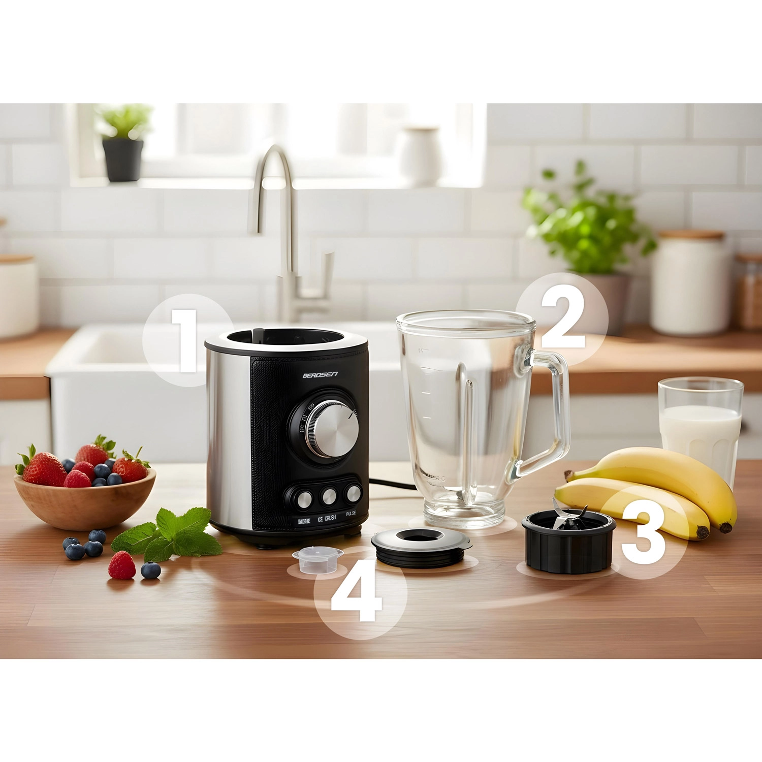 Le blender BERDSEN est un allié fiable pour une cuisine saine au quotidien. Son moteur puissant de 800 W et ses lames en acier inoxydable tranchantes viennent à bout des légumes durs, des noix et des glaçons. Le pichet en verre 1,5 l spacieux est durable, n’absorbe pas les odeurs et se nettoie facilement.