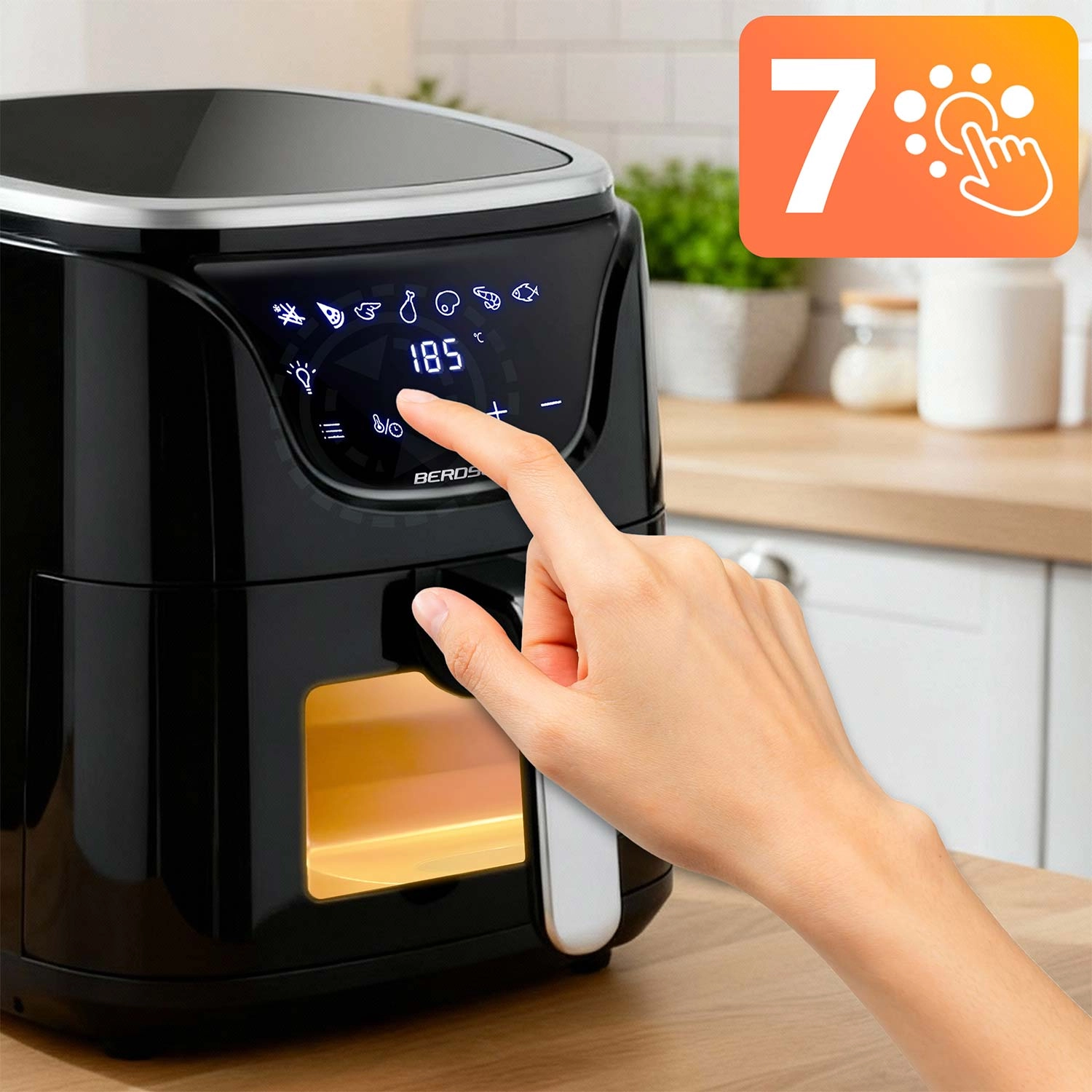 La friteuse à air chaud BERDSEN BD-652 offre une cuisson rapide et savoureuse sans huile superflue. Son panneau tactile moderne avec icônes claires et fenêtre transparente vous permet de garder vos plats sous contrôle sans ouvrir le panier. Grâce à son volume de 5 l, préparez facilement un dîner familial, une grande portion de frites pour les amis ou des légumes rôtis pour toute la semaine.