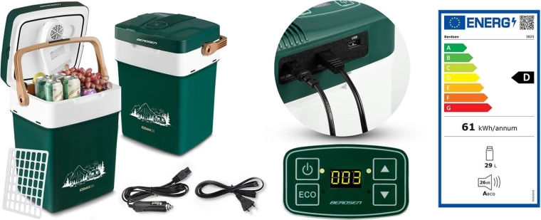 Profitez de boissons et de repas frais en voyage avec la glacière auto BERDSEN ICEMAX d’une capacité de 29 l. Grâce au refroidissement et au chauffage thermoélectriques, elle maintient tout à la température idéale – du refroidissement jusqu’à 18 °C en dessous de la température ambiante au chauffage jusqu’à +65 °C. Un mode ECO pratique, un afficheur électronique avec réglage de la température, une sortie USB pour la recharge du téléphone et une alimentation 12 V et 230 V font de cette glacière le compagnon idéal pour les vacances, le camping et la voiture.