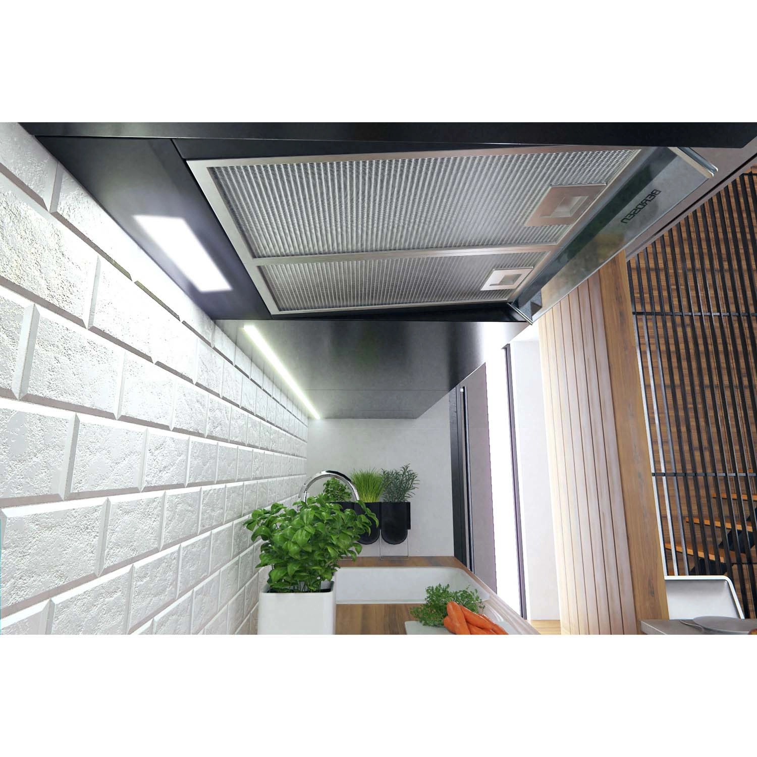 Une hotte stylée et fonctionnelle pour cuisines modernes ou classiques. Le corps en acier inoxydable noir s’harmonise avec la plupart des appareils, et l’installation discrète sous meuble permet de gagner de la place. Trois vitesses d’aspiration adaptent la puissance à la cuisson, tandis que l’éclairage LED illumine uniformément la table de cuisson.