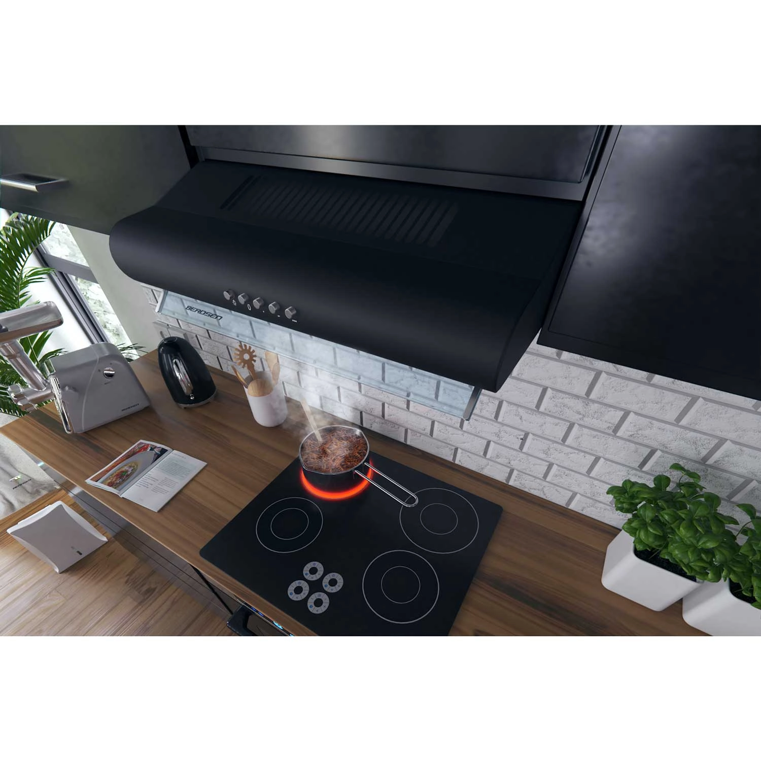 Le modèle BERDSEN BE-10A est une hotte sous-meuble compacte et élégante qui s’intègre parfaitement aux cuisines modernes comme classiques. La finition noire en acier inoxydable est complétée par un panneau en verre qui souligne l’esthétique raffinée de l’appareil. Un moteur performant offrant un débit maximal de 205 m³/h garantit un air frais durant la cuisson, tandis que l’éclairage LED (1×2 W) illumine parfaitement la surface de cuisson.
