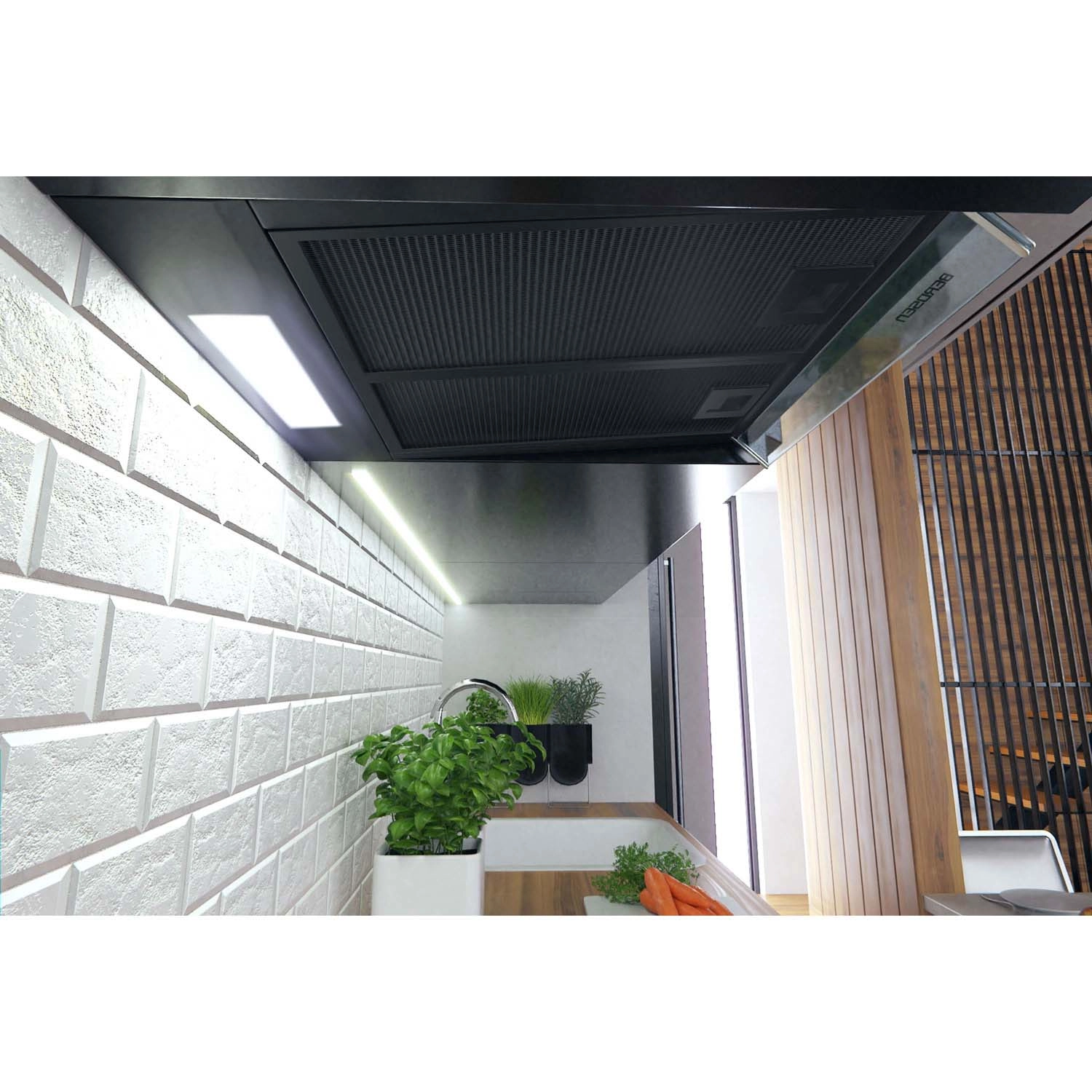 Avec un débit maximal de 205 m³/h, elle élimine aisément vapeur et odeurs lors de la cuisson courante. La hotte peut être installée sous un meuble ou directement au mur et fonctionne en deux modes – évacuation vers un conduit ou recyclage de l’air via le filtre à charbon Berdsen TYPE-A (en option, non inclus). Le filtre aluminium 5 couches est lavable et assure une efficacité durable.