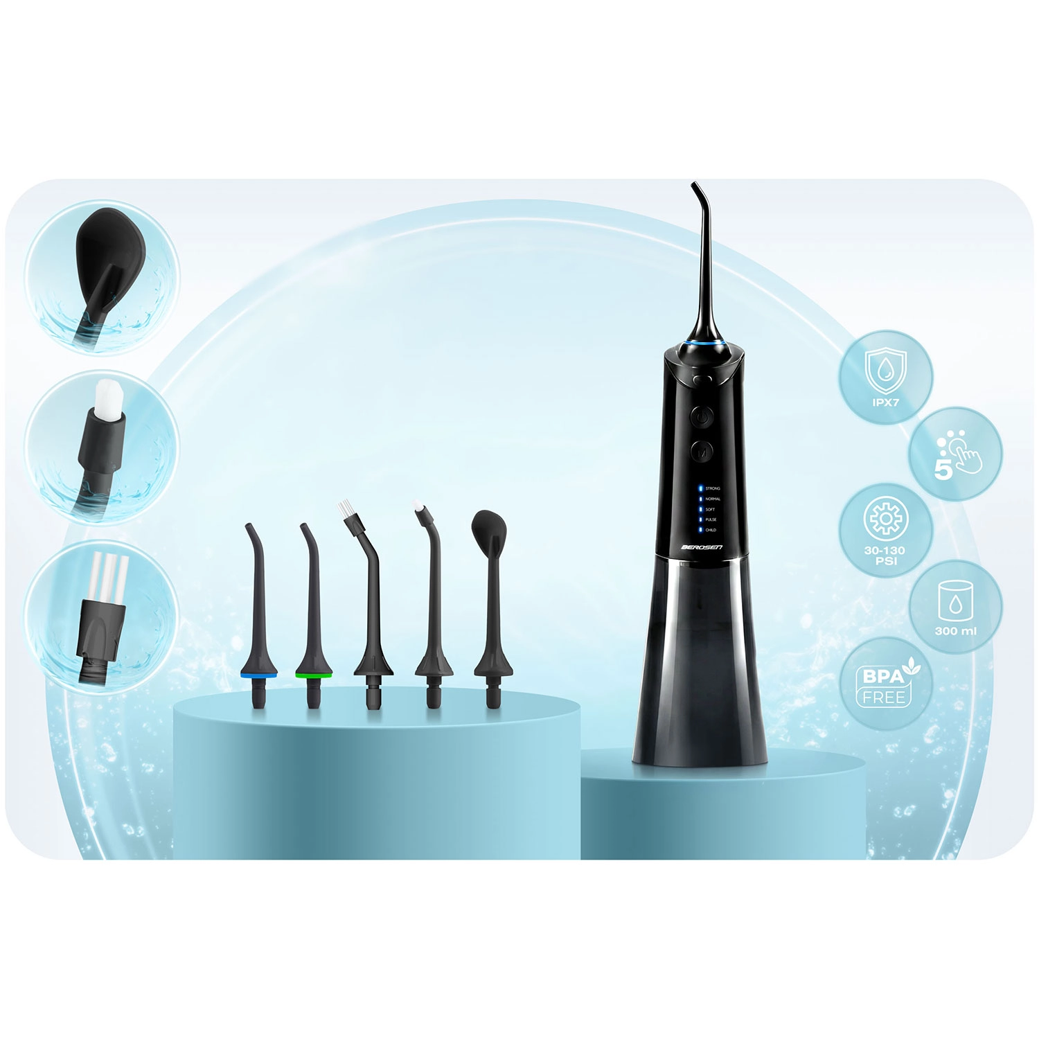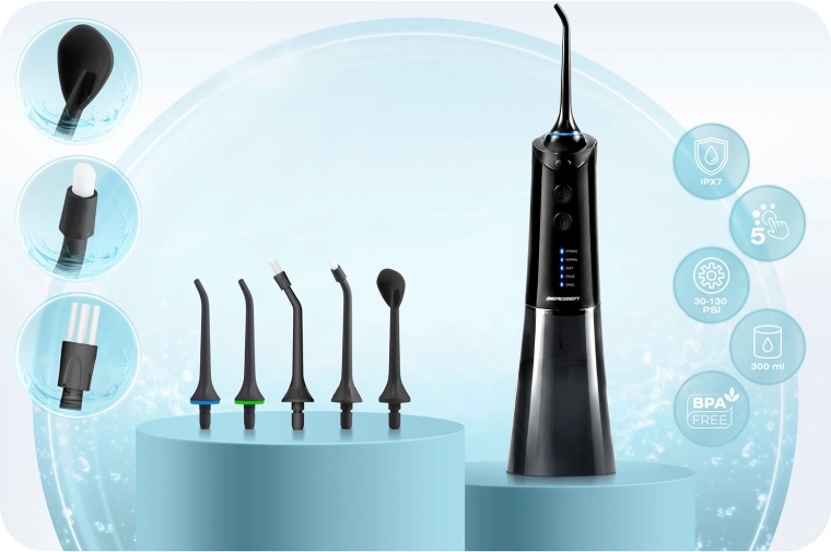 Obtenez un nettoyage minutieux mais doux des espaces interdentaires et de la ligne gingivale. L’hydropulseur Berdsen allie puissance et confort : jusqu’à 1800 pulsations/min pour éliminer efficacement la plaque et les résidus alimentaires, cinq modes de fonctionnement du plus doux au mode pulsé, et un grand réservoir de 300 ml pour une utilisation prolongée sans interruption.