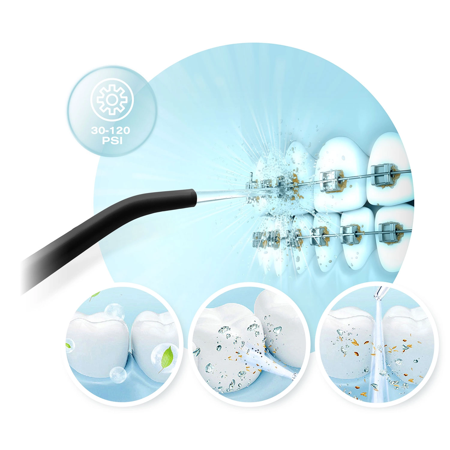 Le coffret comprend 5 embouts pour différents besoins : embouts standards pour l’irrigation quotidienne (2 pcs), embout pour la langue pour une haleine fraîche, embout orthodontique pour appareils et couronnes, et embout parodontal pour le nettoyage des poches plus profondes (à utiliser de préférence avec une pression plus basse).