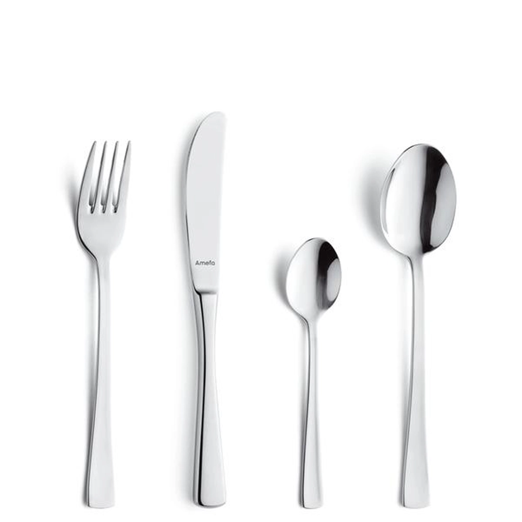 Élégant set de couverts Amefa Neptune pour 6 personnes, au design moderne, hautement poli et fabriqué en acier inoxydable 18/0. Les couteaux à lame dentelée et manche plein offrent une excellente coupe, et l’ensemble est compatible lave-vaisselle pour un entretien facile.