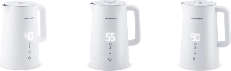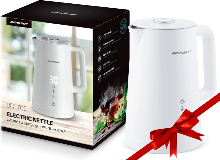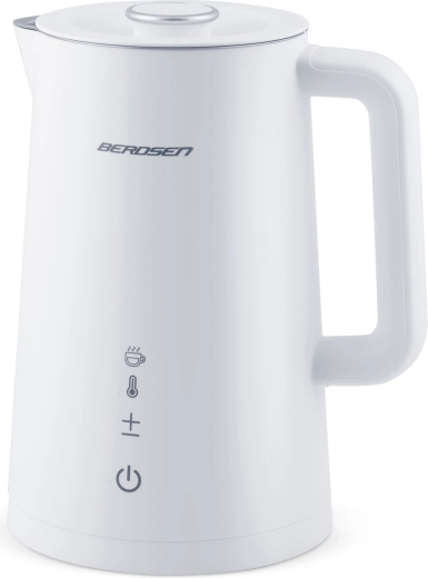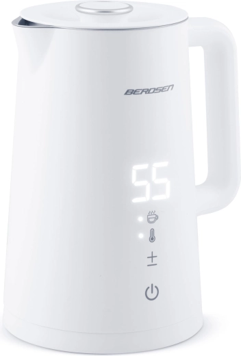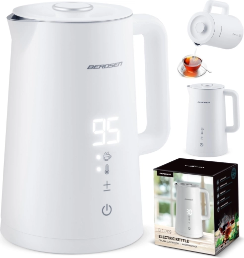 La bouilloire électrique élégante BERDSEN de 1,7 l offre un réglage précis de la température sur 5 niveaux, un panneau tactile avec affichage LED, une fonction de maintien au chaud jusqu’à 2 heures et une construction à double paroi CoolTouch sûre. L’intérieur en acier inoxydable SUS 304 garantit un goût d’eau pur et une longue durée de vie.
