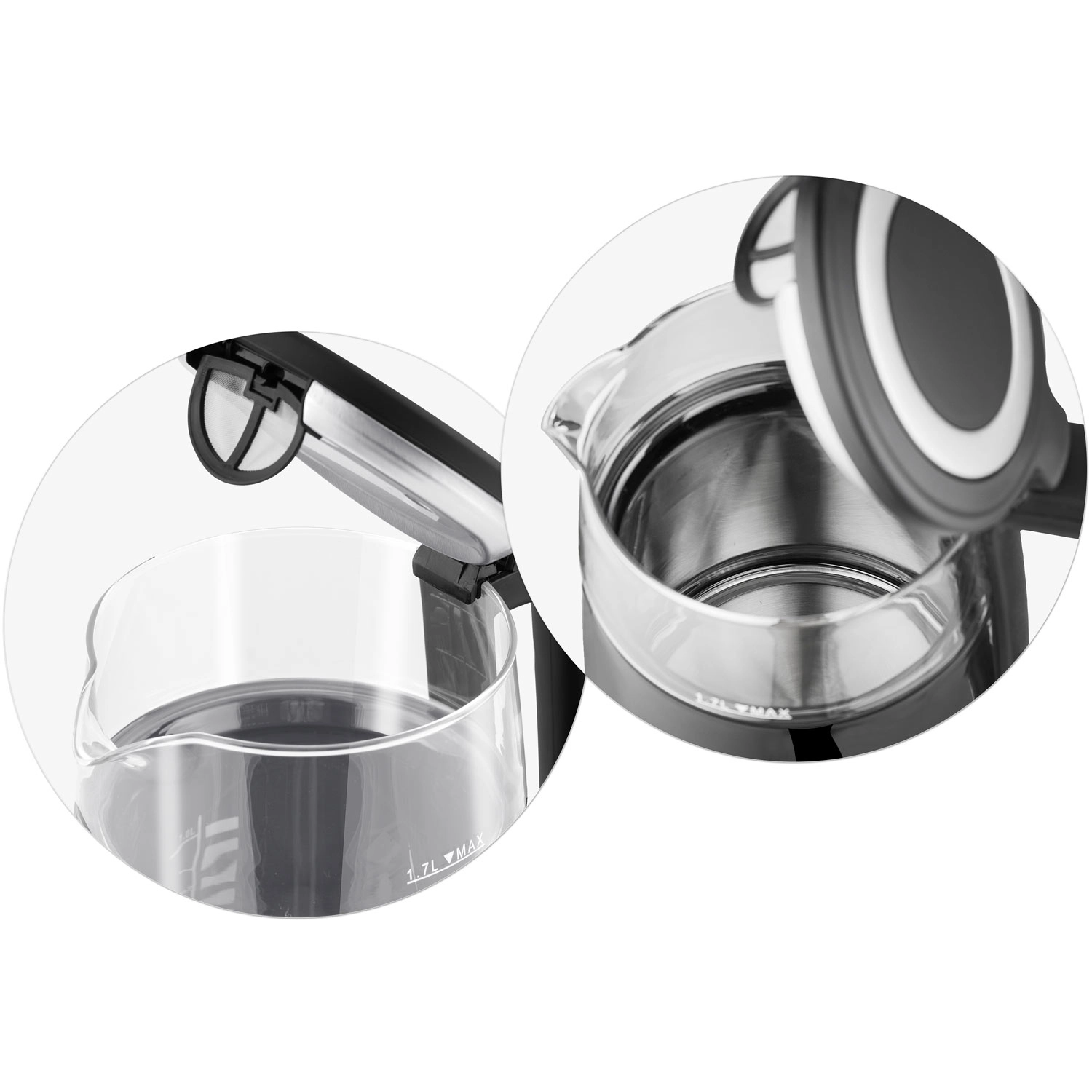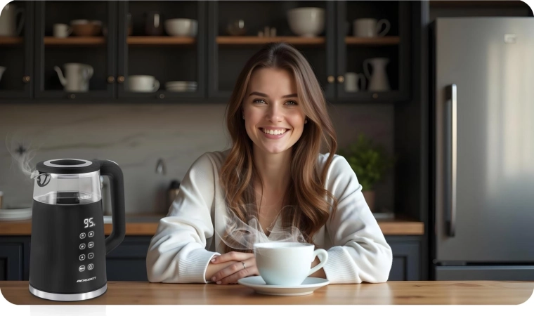 Bouilloire électrique moderne 1,7 l avec panneau tactile, réglage précis de la température (70/80/90/100 °C) et fonction maintien au chaud jusqu’à 2 heures. L’association de l’acier inoxydable SUS 304 et du verre trempé garantit un goût d’eau pur, une longue durée de vie et un style élégant. La construction isolée CoolTouch protège des brûlures et facilite un transport sûr.