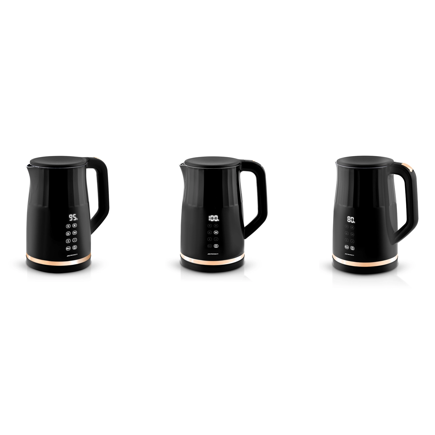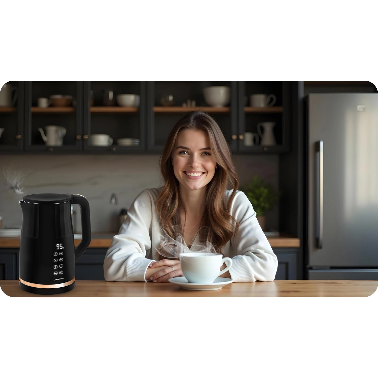 Profitez d’un chauffage précis de l’eau pour le thé, le café et les infusions. La commande tactile est facile à utiliser et l’écran clair affiche la température en temps réel. La bouilloire BERDSEN associe un design noir élégant à des accents métalliques, une poignée ergonomique et un fonctionnement sûr grâce à la protection contre la marche à sec.