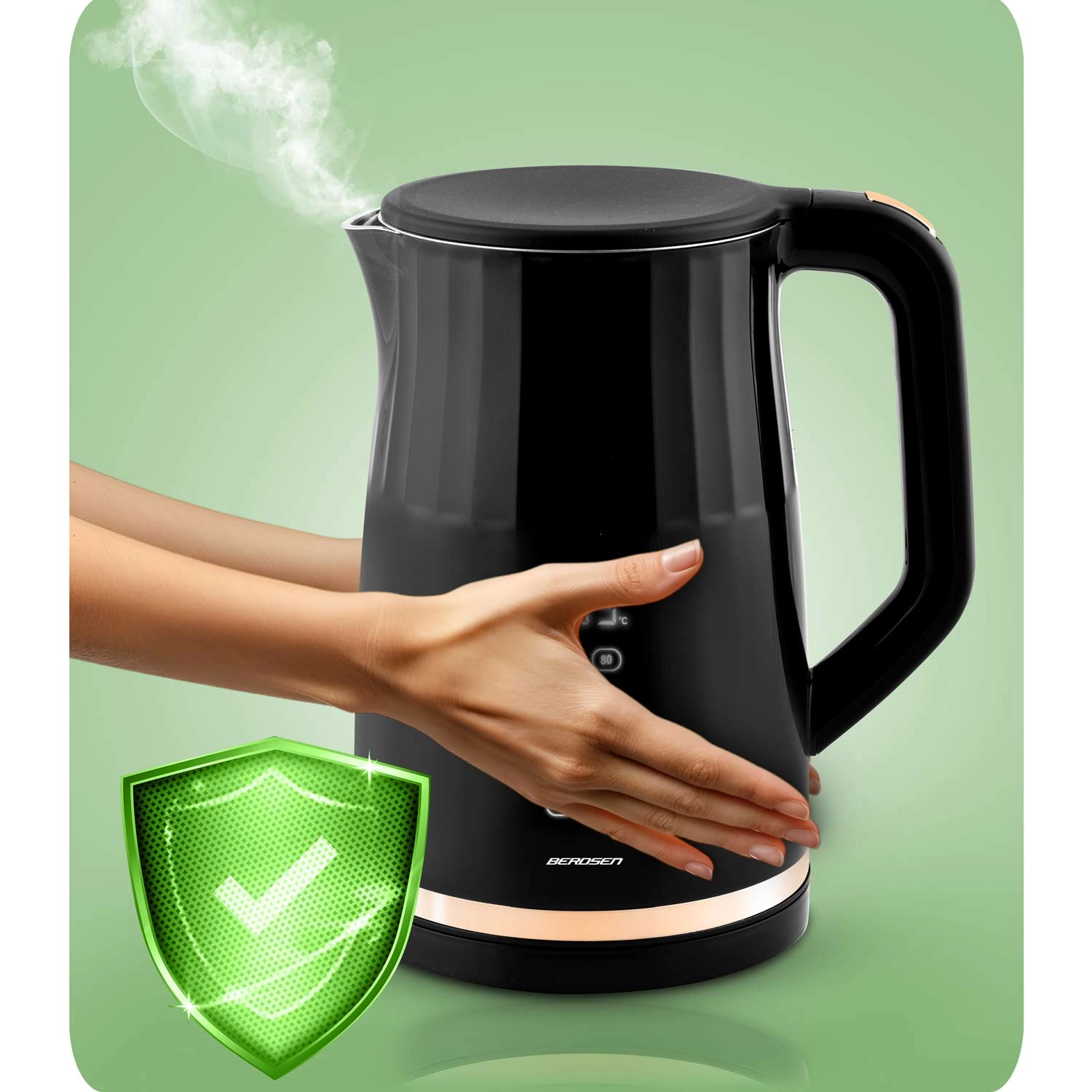 La bouilloire électrique moderne BERDSEN d’une capacité de 1,7 L offre un panneau tactile avec indicateur numérique de température, 4 températures préréglées (70/80/90/100 °C) et une fonction de maintien au chaud jusqu’à 2 heures. Grâce à sa construction isolée à double paroi CoolTouch, la surface reste froide au toucher, tandis que l’intérieur en acier inoxydable SUS 304 garantit une eau au goût pur, sans BPA.