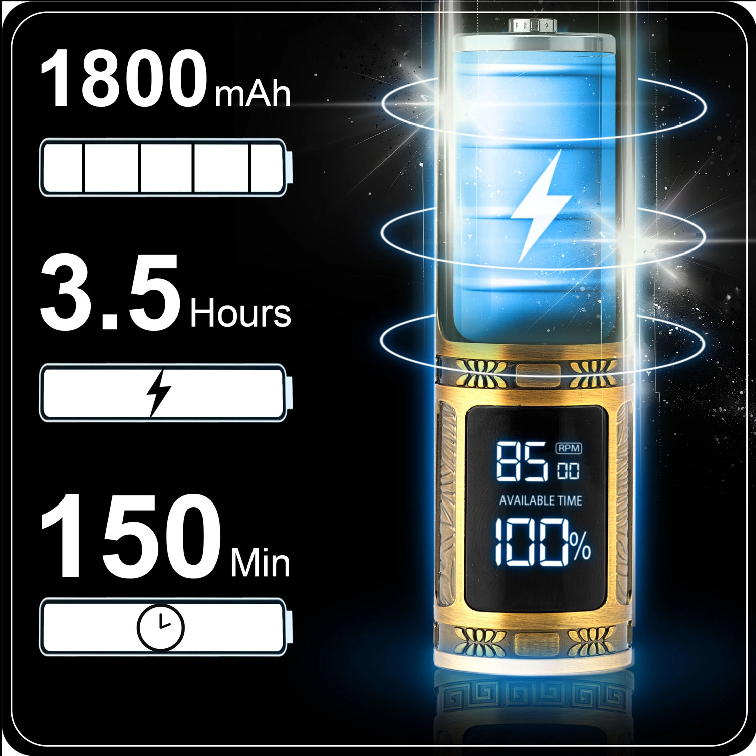 L’écran LCD affiche l’état de la batterie et la vitesse, vous offrant un contrôle total pendant la coupe. La batterie Li‑Ion 1800 mAh assure jusqu’à 2,5 heures de travail ininterrompu, la charge via USB‑C dure environ 3,5 heures. Le coffret comprend également 6 sabots (1,5–9 mm) pour des transitions fluides et différentes longueurs, ainsi qu’une brosse de nettoyage et un câble USB‑C.