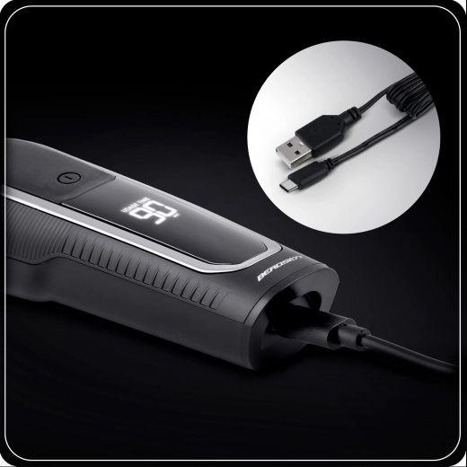 - 5 têtes interchangeables (modelage, 2× précision – large/étroite, nez/oreilles, corps, micro rasoir à grille)