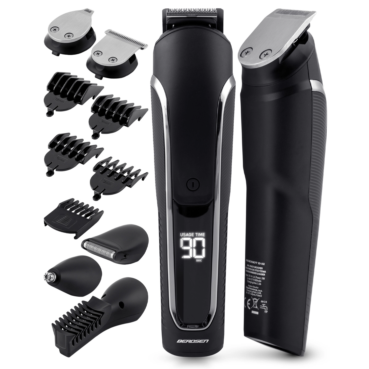 Tondeuse et set de rasage 6‑en‑1 BERDSEN pour cheveux, barbe et corps avec écran LCD, lames en acier tranchantes et batterie jusqu’à 90 minutes. Chargement USB‑C, 5 têtes interchangeables et 5 sabots (1–12 mm) pour un coiffage précis, les contours et un rasage net. Ergonomique, sans fil et prêt pour le styling quotidien.