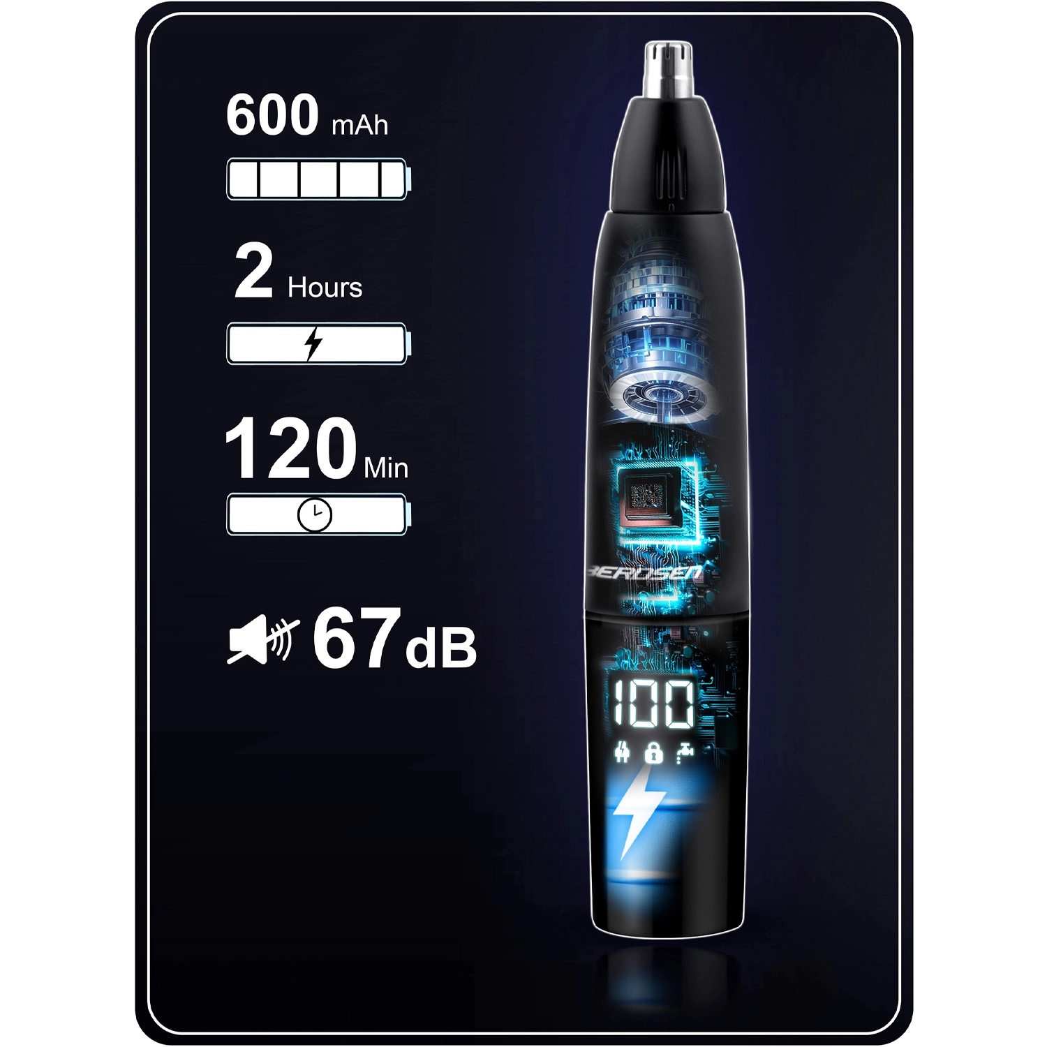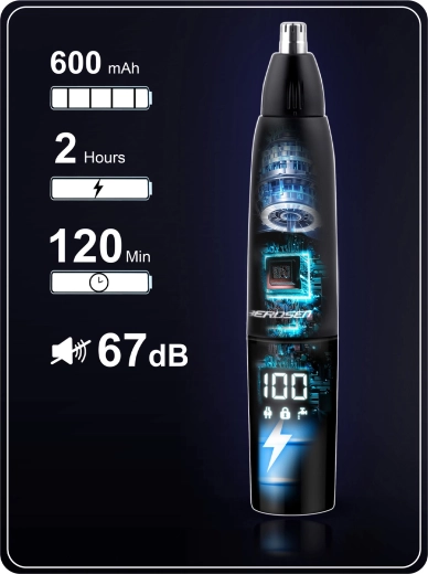 BERDSEN BD‑269 est une tondeuse polyvalente 3‑en‑1 pour le nez, les oreilles et les finitions de barbe. Les lames doubles en acier garantissent une coupe douce et précise sans risque de blocage. L’écran LCD intégré affiche l’état de la batterie et la vitesse de rotation pour un contrôle total de votre style.