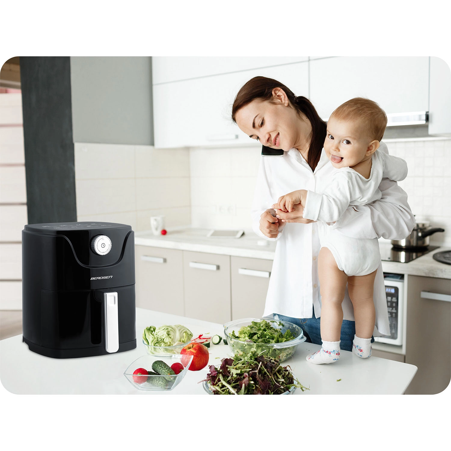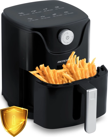 La friteuse à air BERDSEN allie une cuisson plus saine à un confort maximal. Le flux d’air chaud moderne garantit une croûte dorée et croustillante à l’extérieur et un cœur juteux à l’intérieur – presque sans huile, sans odeur et sans éclaboussures. Sa capacité compacte de 2,5 l est idéale pour un déjeuner rapide, des en-cas du soir ou des repas légers en semaine.