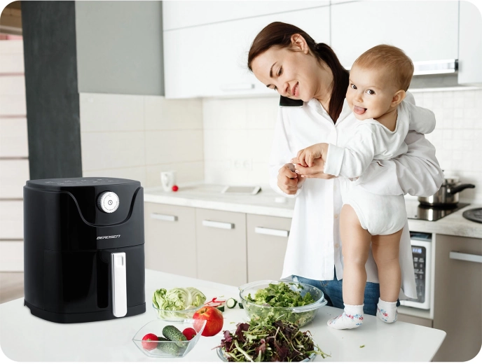 La circulation avancée de l’air chaud assure une surface croustillante et un intérieur juteux, sans huile superflue. Idéal pour les frites, le poulet et les légumes.