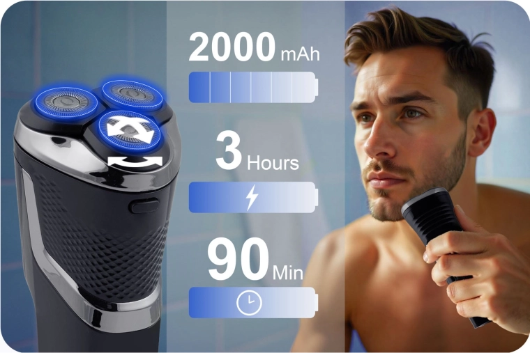 La triple tête rotative en acier inoxydable s’adapte aux lignes du visage et assure un rasage rapide, délicat et précis au quotidien.