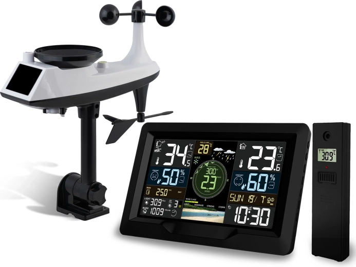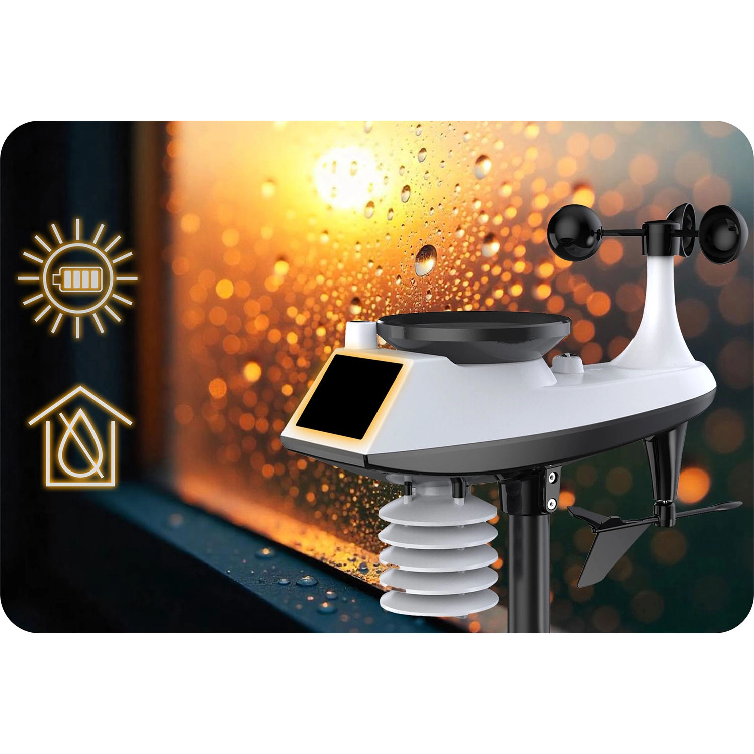 Cette station météo moderne est idéale pour la maison, le jardin et l’atelier. Grâce aux multiples capteurs, vous obtenez une vue d’ensemble complète des conditions – température et humidité intérieures et extérieures, direction et vitesse du vent, cumul des précipitations, pression, indice UV et intensité lumineuse. L’écran couleur propose 4 niveaux de luminosité, prend en charge plusieurs langues et affiche aussi la prévision météo sur 12 heures, la phase de la lune, la date et l’heure.