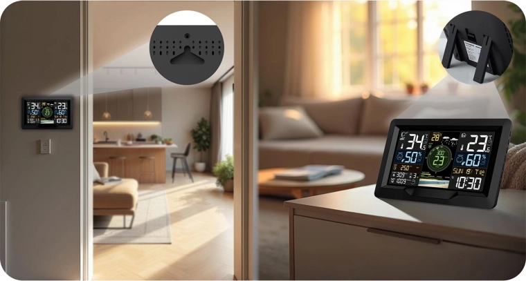 Via le Wi‑Fi et la plateforme Tuya Smart, vous consultez les données et statistiques à tout moment sur votre téléphone. La station synchronise automatiquement l’heure via DCF77 et permet de connecter des capteurs supplémentaires. Deux alarmes programmables, fonction snooze et calendrier perpétuel jusqu’en 2099 font de l’appareil un assistant pratique au quotidien.