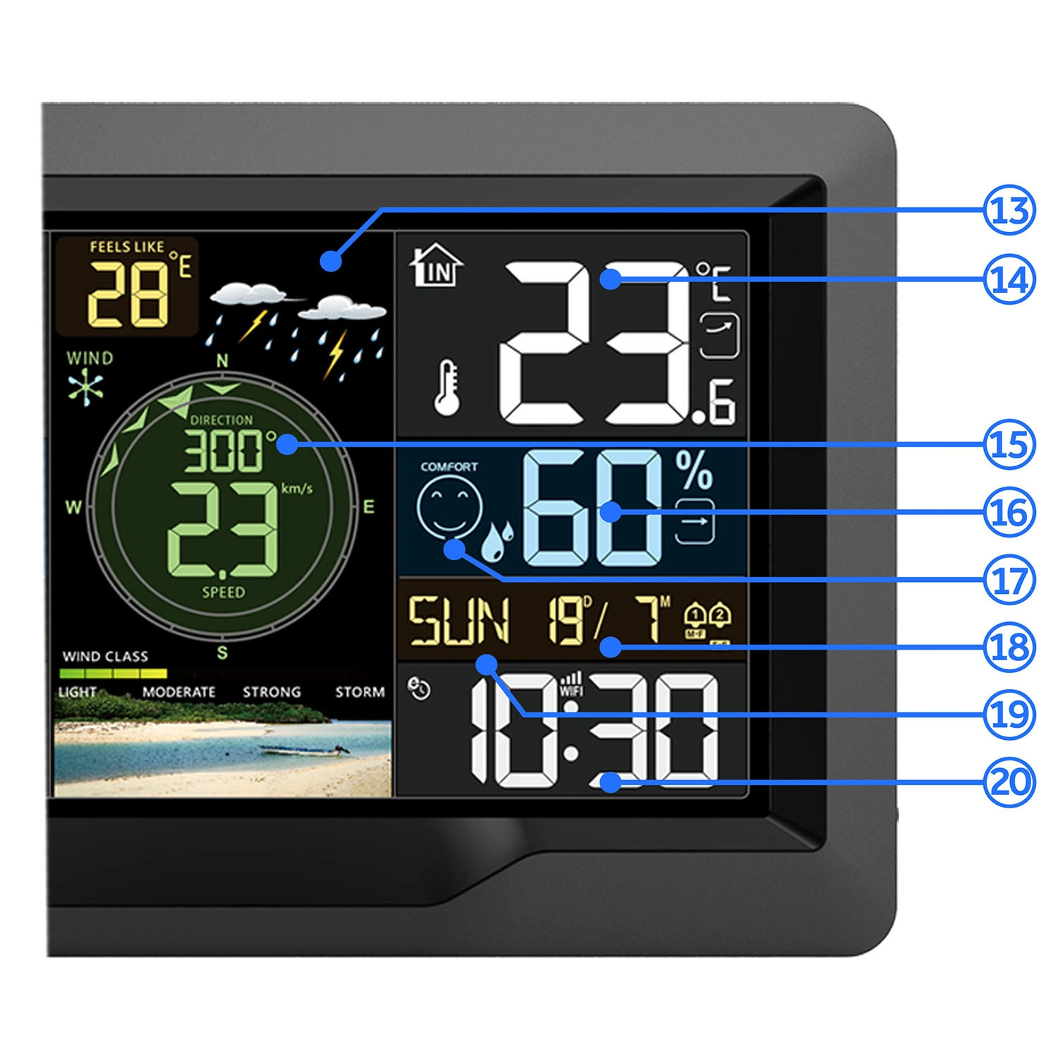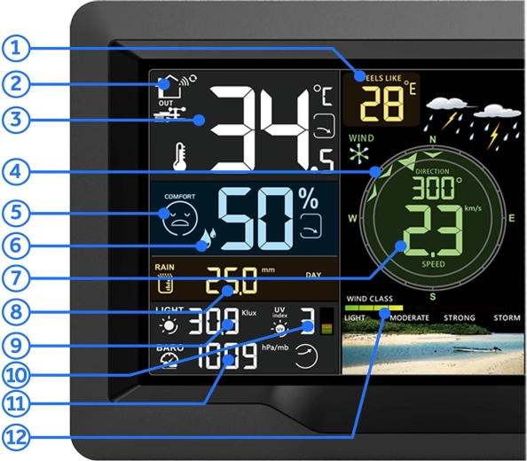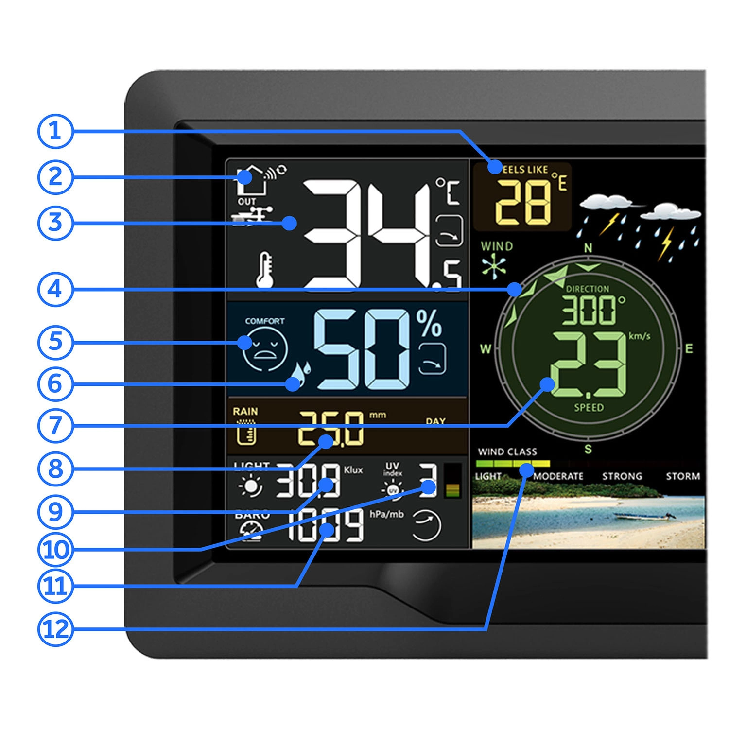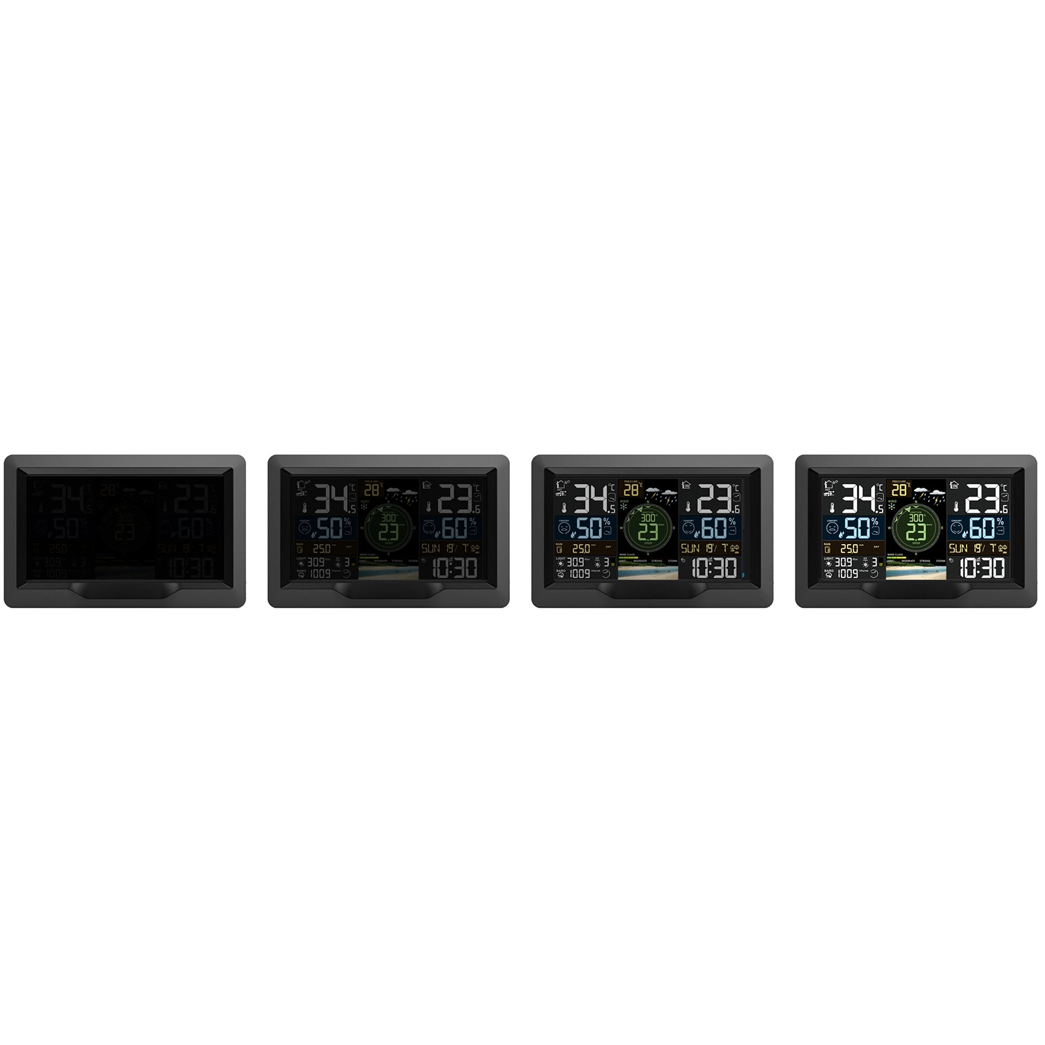 Le grand écran multicolore affiche la température, l’humidité, le vent, la pression, l’heure et la prévision au moyen d’icônes claires. Données lisibles de jour comme de nuit grâce au variateur.