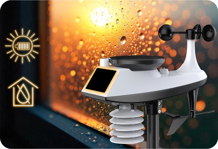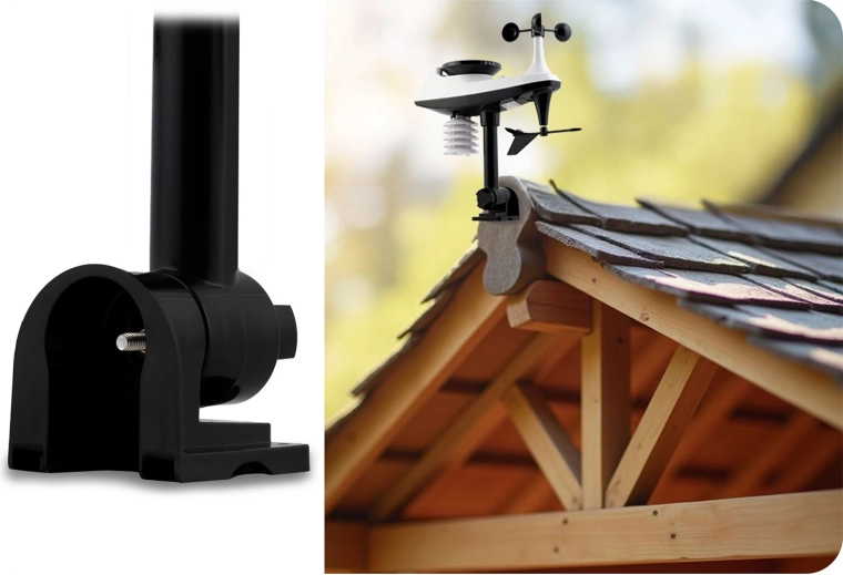 Le capteur extérieur avec anémomètre, girouette et pluviomètre fournit des données précises sur la vitesse et la direction du vent, ainsi que sur le cumul des précipitations – idéal pour planifier vos activités en plein air.