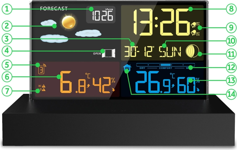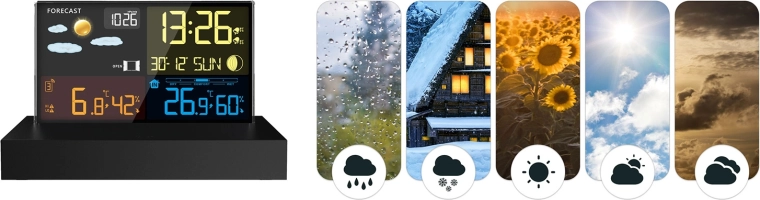- Écran LCD couleur avec icônes météo, phases de la Lune et état de la batterie