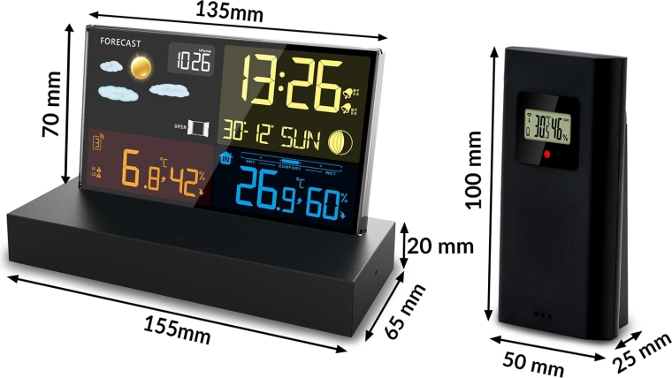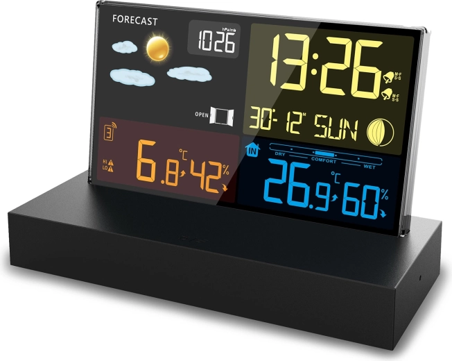 La BD-912 est une station météo de table domestique fiable avec un écran LCD couleur clair, qui affiche l’heure, la date, la température et l’humidité intérieures et extérieures, les tendances, la prévision météo et la pression atmosphérique. L’heure radio-pilotée DCF garantit une précision sans souci et la fonction de réveil avec répétition convient aussi bien à la table de nuit qu’au bureau.